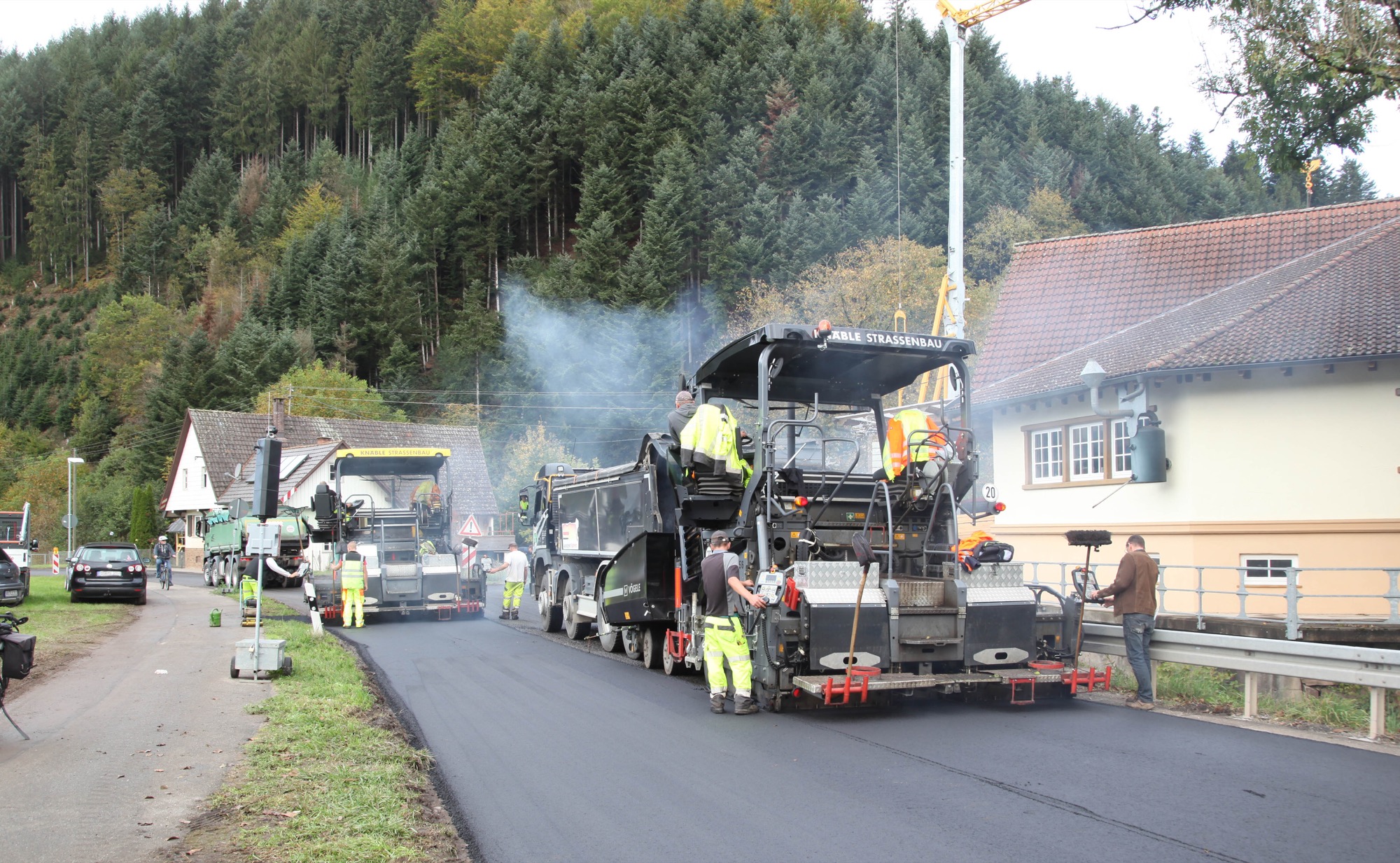 Die Sanierungsarbeiten als Abschluss der Entschärfung einer Gefahrenstelle entlang des Radweges in der Kurve beim Lunzenbauernhof/Sägewerk Klaus Lehmann kommen gut voran und liegen im Zeitplan. Auf dem rund 900 Meter langen Teilstück zwischen Zell-Unterharmersbach (Sägewerk Burger) und dem Ortsschild von Oberharmersbach wird momentan die Schwarzdecke eingebaut. An die 600 Tonnen verteilen zwei Fertiger auf etwa 6.000 Quadratmeter Straßenfläche.