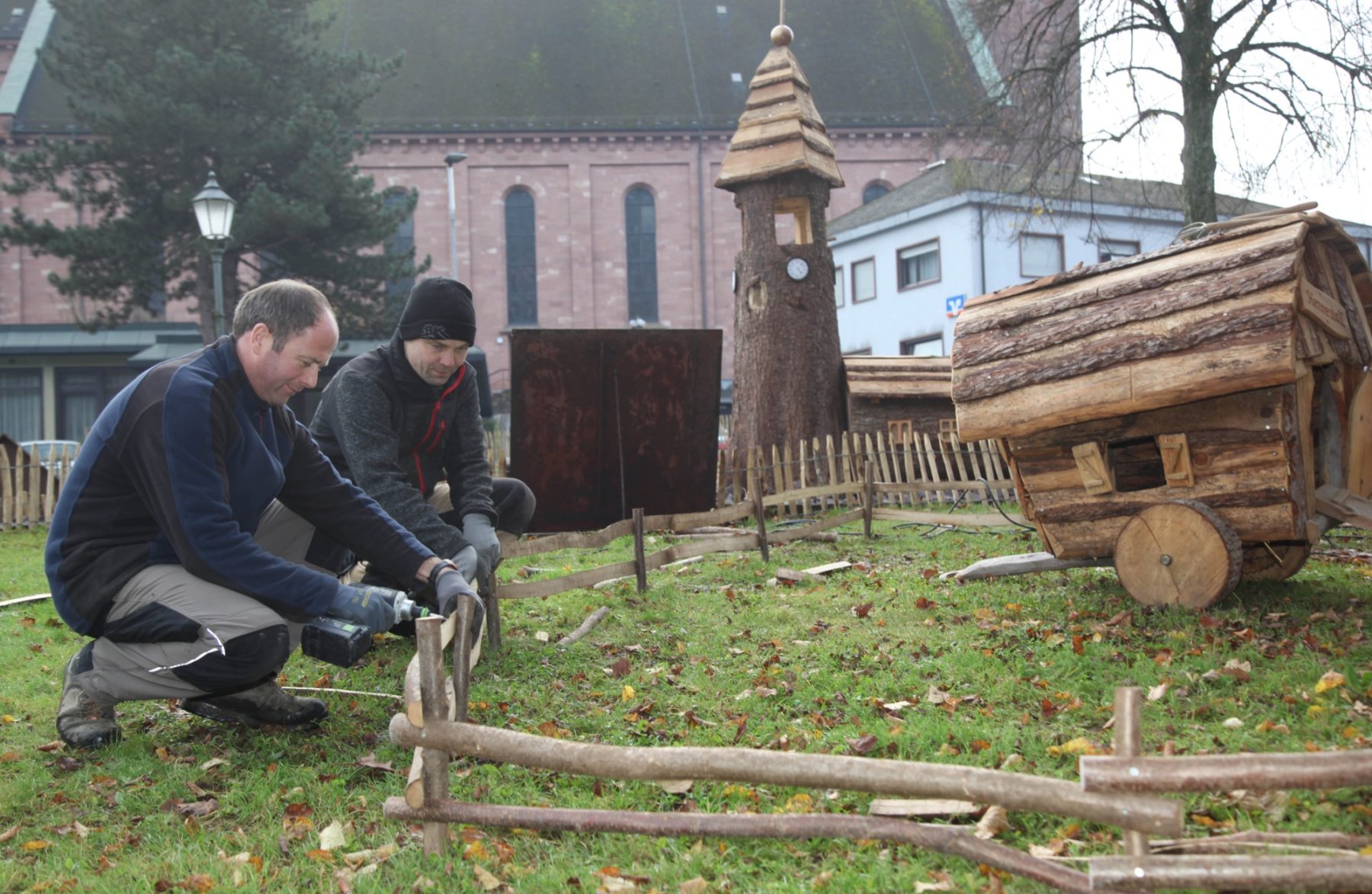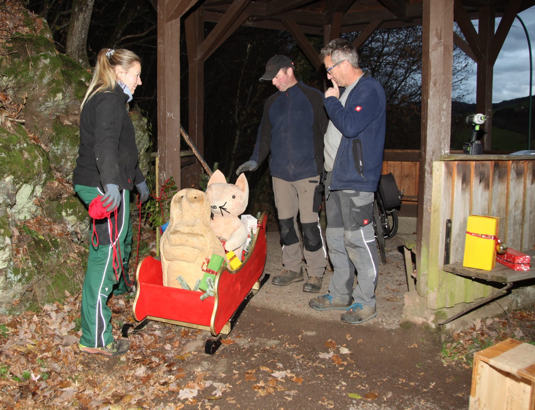 Dem Bauhof geht die Arbeit nicht aus. Es gilt noch den Motivweg an der Katzenhalde einzurichten. Die Geschichte »Der kleine Igel und der Weihnachtsschlitten« wird an verschiedenen Stationen mit den passenden Figuren, Texten und entsprechendem Zubehör bestückt. Die Mühe lohnt, denn bis zum 6. Januar 2020 können Alt und Jung von der Brücke »Am Schrofen« wie in den vergangenen Jahren auf dem Weg entlang der Katzenhalde wieder ins Dorf zurückkehren.