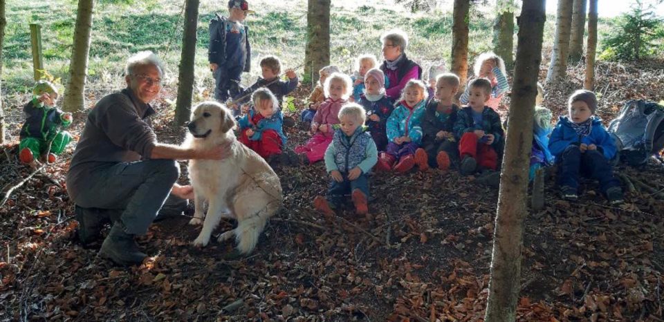 Die Kinder vom »Bauen und Konstruieren« verbrachten einen tollen Tag im Wald mit Förster Lehmann und Hündin Inka. Foto: Kinderhaus Sonnenblume