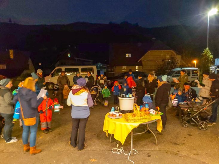 Gemeinsam mit ihren Eltern und den Erzieherinnen Silvia und Hannah trafen sie sich abends am »staubfreien Weg«. Die Kinder hatten ihre selbstgebastelten Laternen dabei, welche stimmungsvoll die Nacht erhellten. In zwei Gruppen zu jeweils zehn Kindern liefen sie nun in Begleitung ihrer Eltern eine kurze Strecke den staubfreien Weg entlang und sangen dabei mit Begeisterung ihre Martinslieder. Es war eine Freude die bunten Laternen in der Dunkelheit leuchten zu sehen. Gerne unterstützen die Eltern den Gesang der Kleinen. Am Ausgangspunkt angekommen wurden alle vom Elternbeirat mit selbstgemachten Leckereien verwöhnt. Franz Lehmann von der Holzofen-Bäckerei hatte Hefesterne für die Kinder gebacken. Und so klang bei Punsch und feinem Gebäck ein gemütliches Fest in kleiner Runde aus. Kindergartenleiterin Christiane Müller-Pfau bedankte sich beim Elternbeirat und der Holzbäckerei Lehmann für die wunderbare Unterstützung.