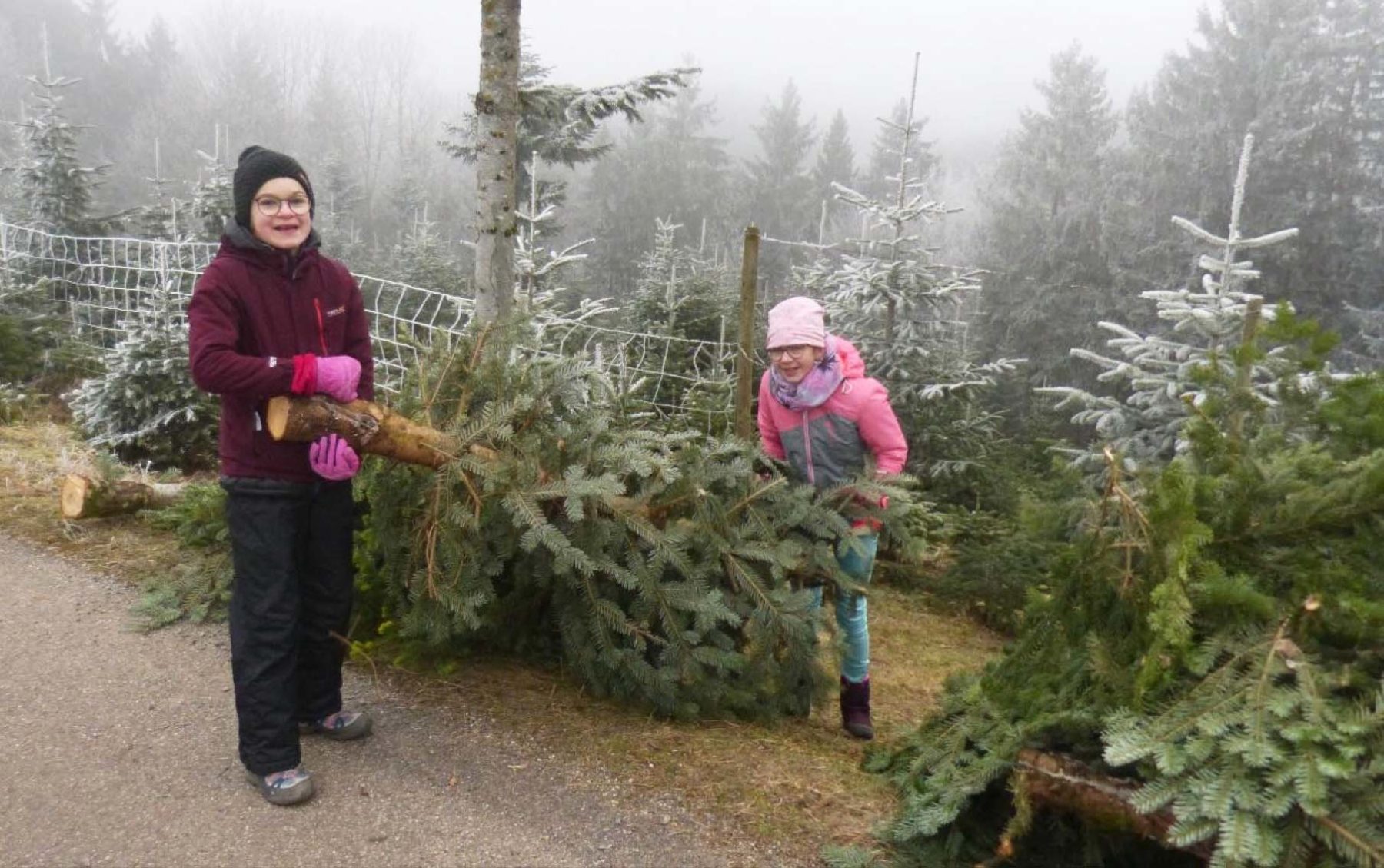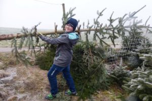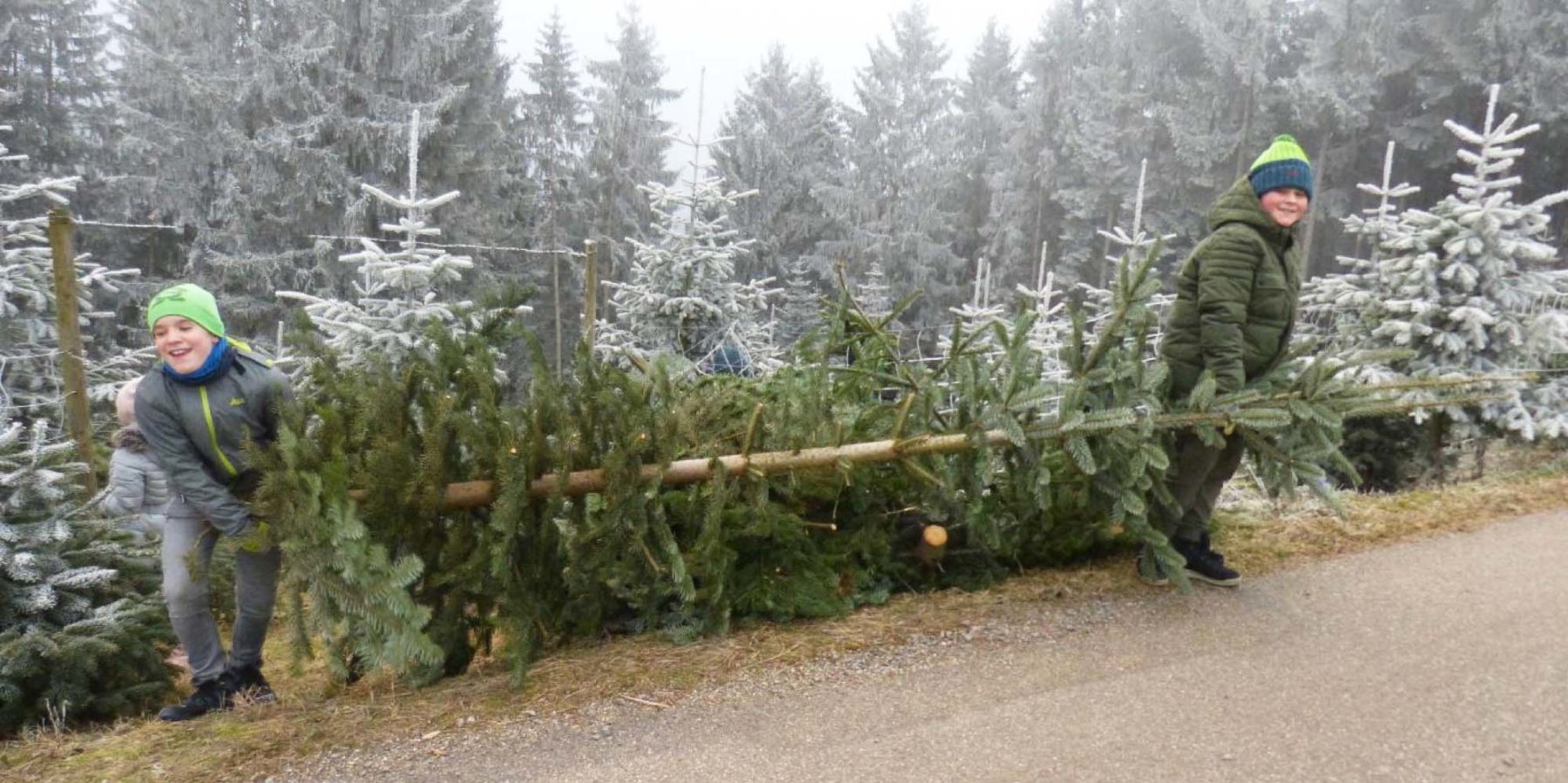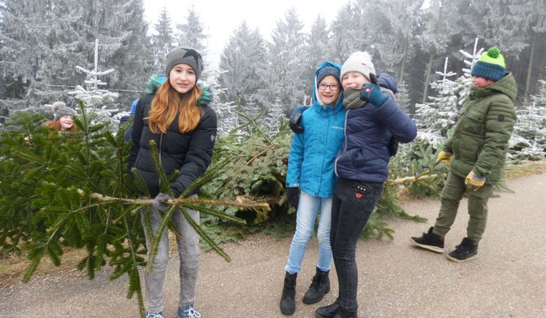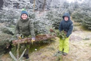 Dieses Jahr waren wir Ende Januar wieder dort. Nachdem wir als Überraschung hinten im Anhänger mit auf den Hof fahren durften, sollten wir bei der Reinigung der Christbaumplantagen helfen. Wir haben abgesägte Äste und schiefe Tannenbäume aus der Plantage getragen. Das hat uns großen Spaß gemacht. Wir haben gemerkt, dass das alles ganz viel Arbeit macht, aber dass es auch sehr schnell gehen kann, wenn viele Helfer beisammen sind.