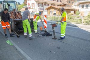 Wohl eher zufällig fällt auch die Verlegung des Glasfaserkabels der Deutschen Telekom mit dieser Straßensanierung zusammen. Von der Ortsvermittlungsstelle beim alten Sportplatz bis zum Kindergarten werden diese Leitungen verlegt, zwar meist im Bereich des Fußgängerwegs, aber mitunter ist auch ein Ausweichen in die Fahrbahn erforderlich.