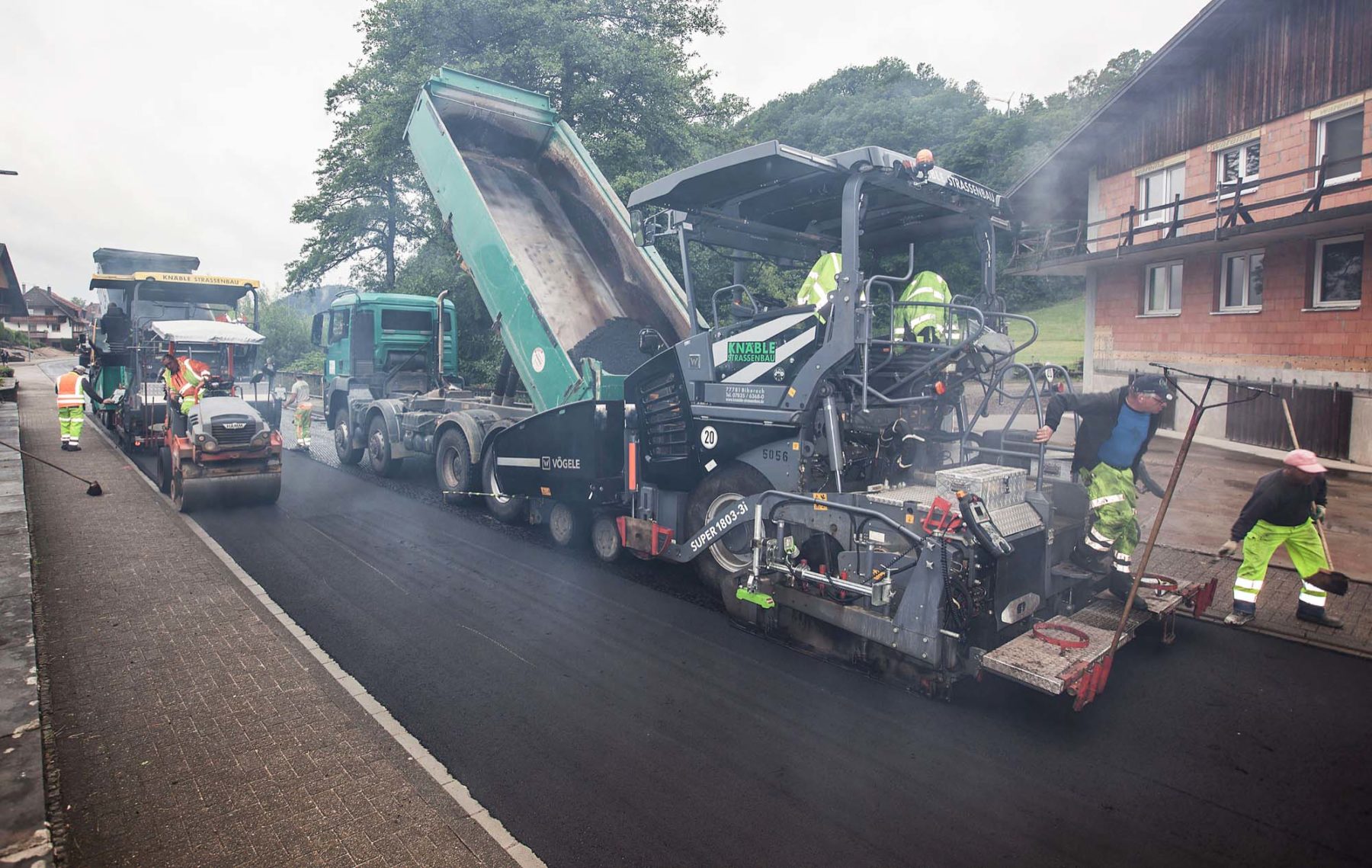 Am heutigen Freitagmorgen begann die Firma Knäble, Biberach, mit dem Einbau der Schwarzdecke. Unter der Leitung von Roman Ohnemus waren auf der 6,20 Meter breiten Fahrbahn zwei Fertiger parallel im Einsatz.