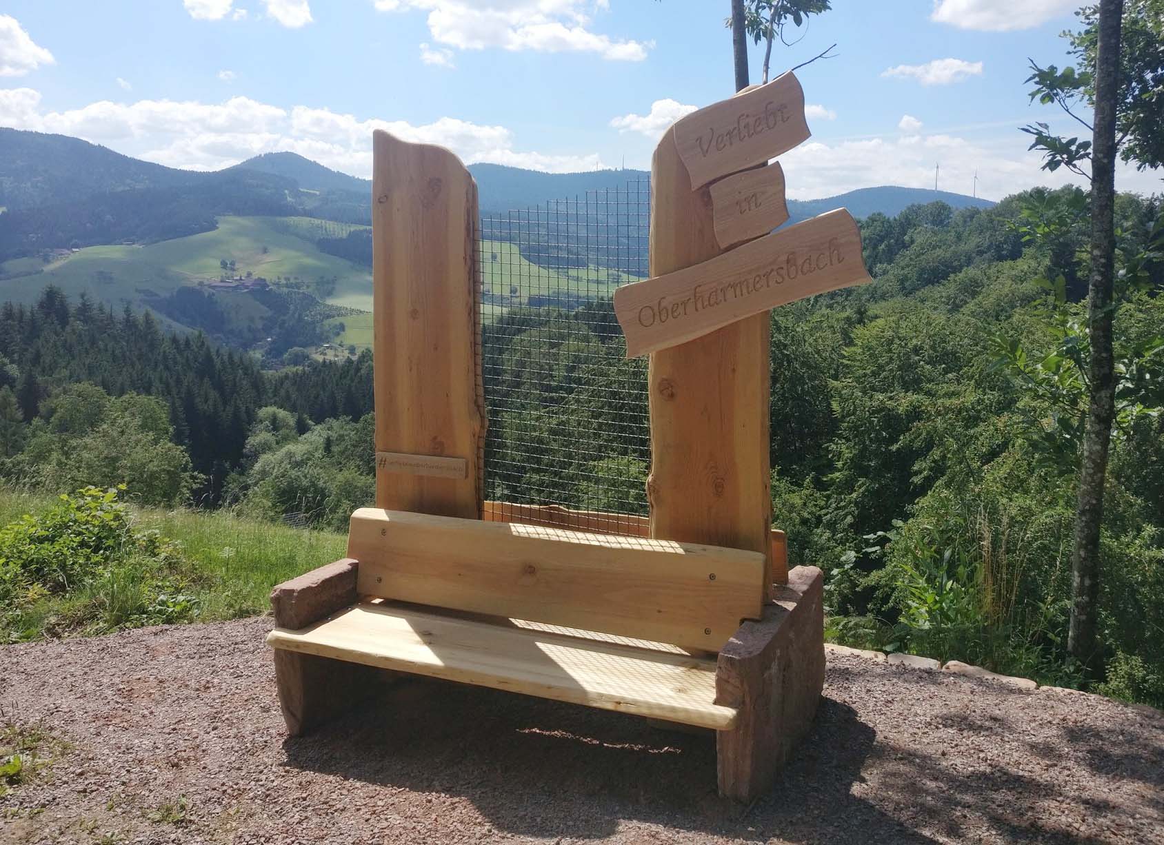 An ungezählten Brückengeländern hängen in großer Zahl Liebesschlösser, die manche Konstruktion an die Grenze ihrer Belastbarkeit bringen. Wer in Oberharmersbach verliebt ist oder sich dort verliebt hat, darf das an einem beschaulichen Plätzchen hoch über dem Harmersbachtal fest einhängen.