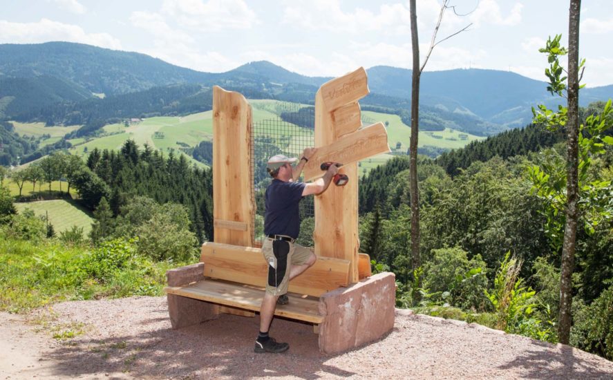Eine Miniaturausgabe der Bank steht im Oberharmersbacher Tourismusbüro. Dort besteht die Möglichkeit, ein Schloss für die Sitzbank zu erwerben und auch gleich eine persönliche Gravur anzubringen.
