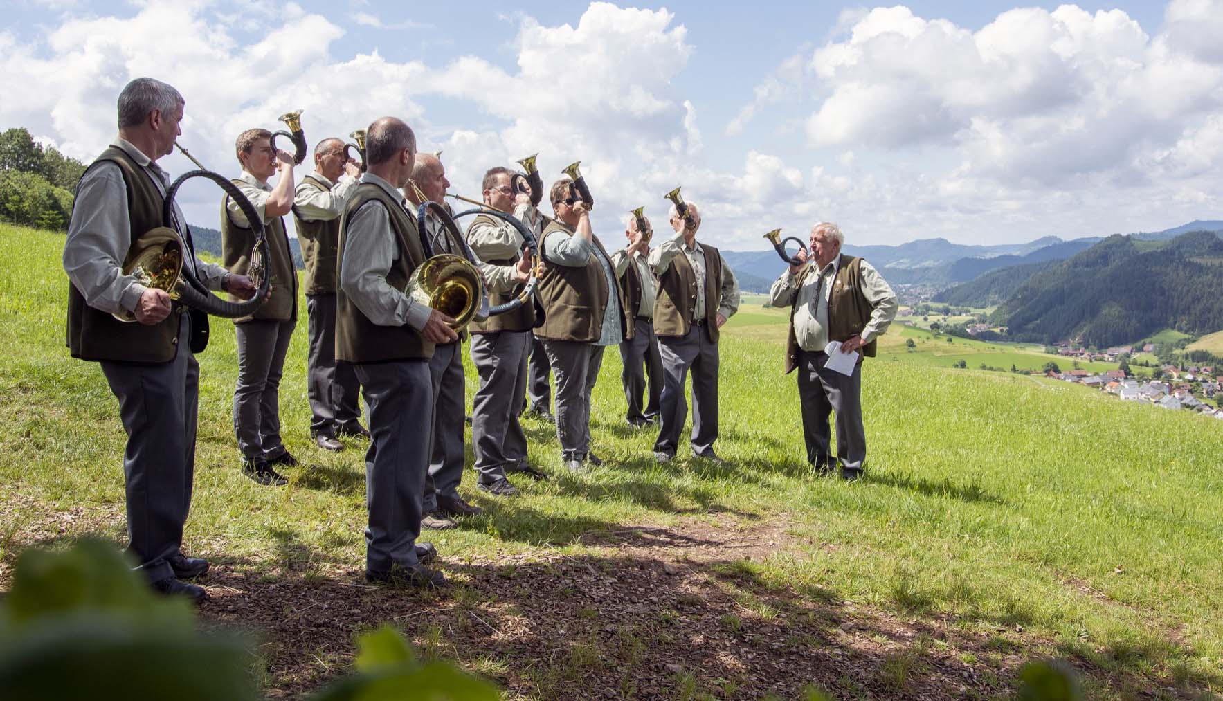 Die Jagdhornbläsergruppe Harmersbachtal wird sich an der 30 Meter langen Baumstamm-Bank auf dem Premiumweg und Schwarzwälder Genießerpfad »Harmersbacher Vesperweg« platzieren und ihre Jagdhornklänge ins Tal schicken. Dieses außergewöhnliche Fleckchen Erde mit fantastischer Aussicht erreicht man nach dem ersten, ca. zwei Kilometer langen, Anstieg.