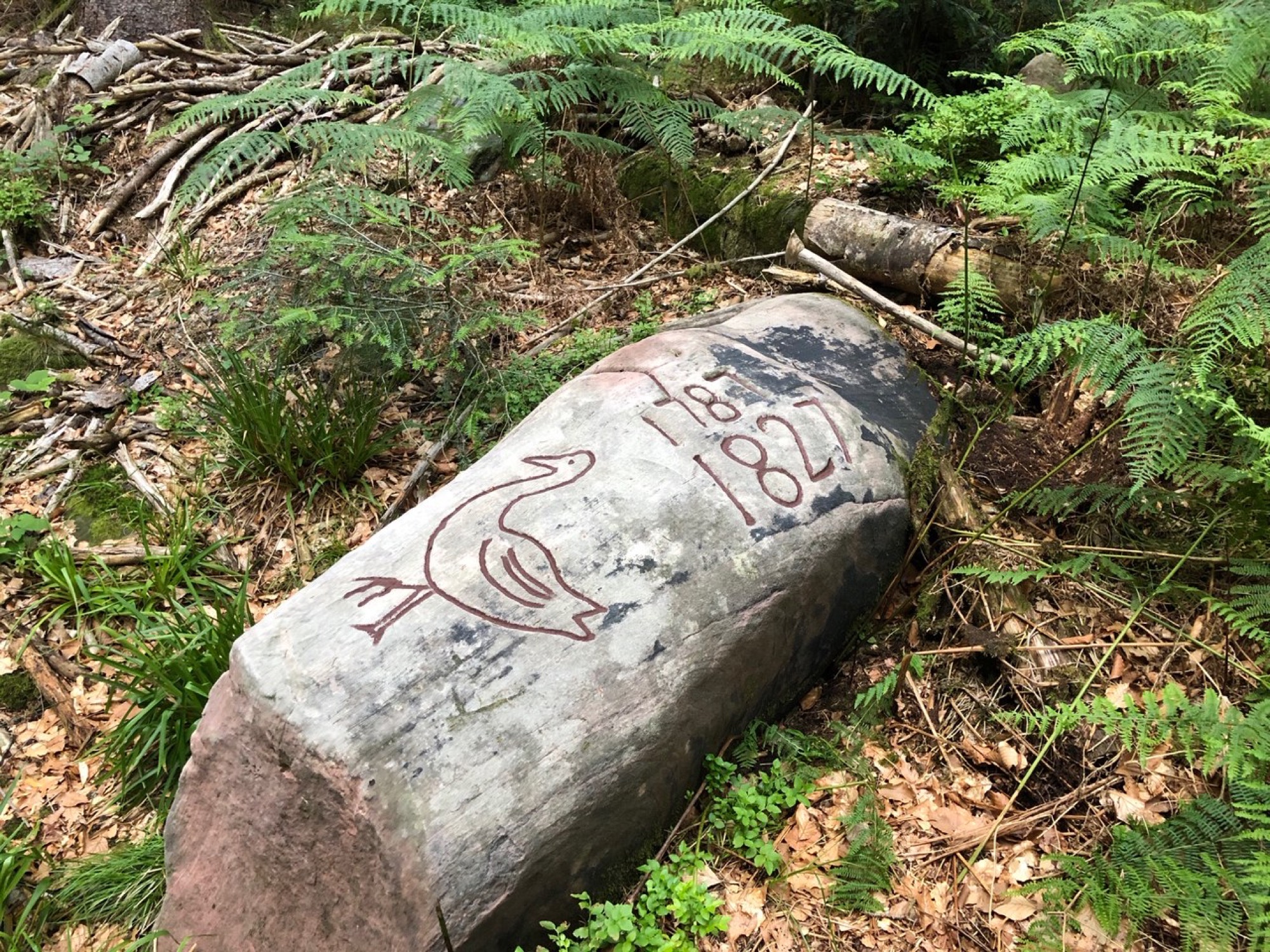 Und der »Girgisenschninder«? Mehr als die kurze Geschichte über seinen vermutlichen Werdegang ist nicht überliefert, weder Vor- noch Familienname. Seine Signaturen hat er wohl in den 1820er Jahren geschaffen, wie die Jahreszahl bei der »Gans« und beim Teufelstein (1827) belegt. Vielleicht hat er zehn Jahre später doch noch seiner Lieblingsbeschäftigung nachgehen können, denn als die ersten Steine für die Oberharmersbacher Pfarrkirche 1836/37 gehauen wurden, waren mitunter über 30 Steinmetze auf der Baustelle. Möglicherweise war der »Girgisenschninder« einer von ihnen…