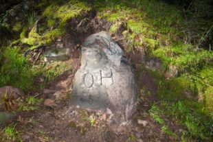 Auch die »Schninderschär« (Abt. 24) ist ein solcher markanter Punkt. Im hinteren Zuwald, wo der Weg durch das enge Tal des Zuwälder Baches Richtung Mühleckle abzweigt, hat der »Girgisenschninder« mitten im Wald einen geeigneten Stein gefunden, in den er eine Schere und die beiden Buchstaben »OH« in einen Sandstein gehauen hat.