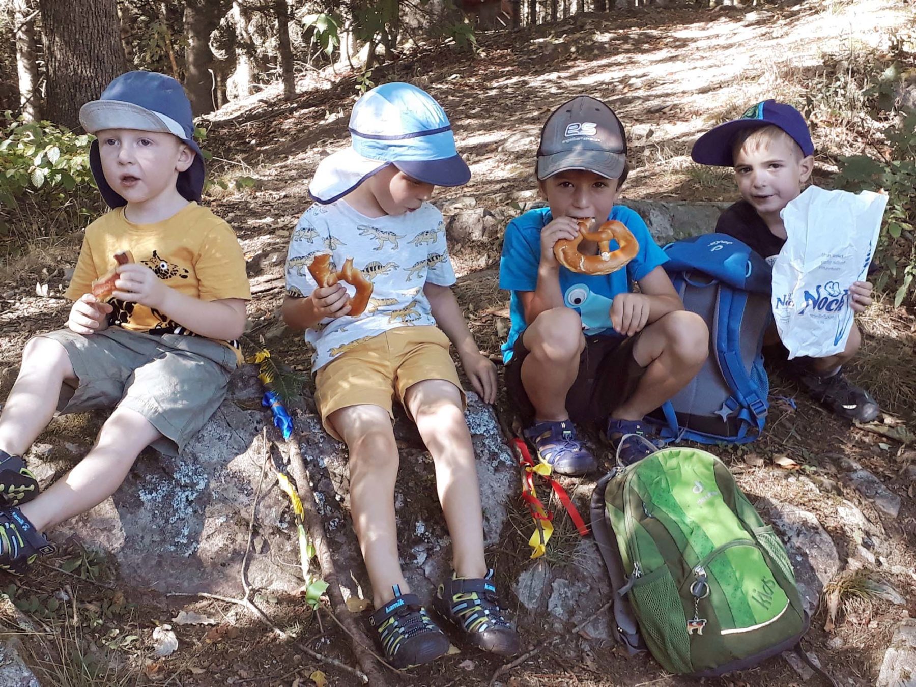 15 Kinder starteten mit ihren Betreuern die Suche an der Reichstallhalle, von wo aus es in den kühleren Wald an der Katzenhalde ging. Die Kinder bekamen nacheinander Hinweise und Aufgaben, die es zu lösen galt, um so dem Schatz immer näher zu kommen. Zu Beginn mussten sich alle Kinder einen Wanderstock suchen, der nach jeder erfüllten Aufgabe mit einem bunten Band geschmückt wurde. Bei der Suche galt es, einen Tannenzweig zu finden, Hinweisbilder zu suchen, zu zählen und in entsprechender Anzahl Steine zu sammeln, um daraus ein Bild zu legen, Tannenzapfenweitwurf und den steilen Weg zum oberen Pavillon zu bewältigen. So wurden die Stöcke der Kinder mit jeder bewältigten Aufgabe immer farbenfroher. Am oberen Pavillon wurde die wohl verdiente Vesperpause gemacht und alle genossen den tollen Ausblick über Oberharmersbach.