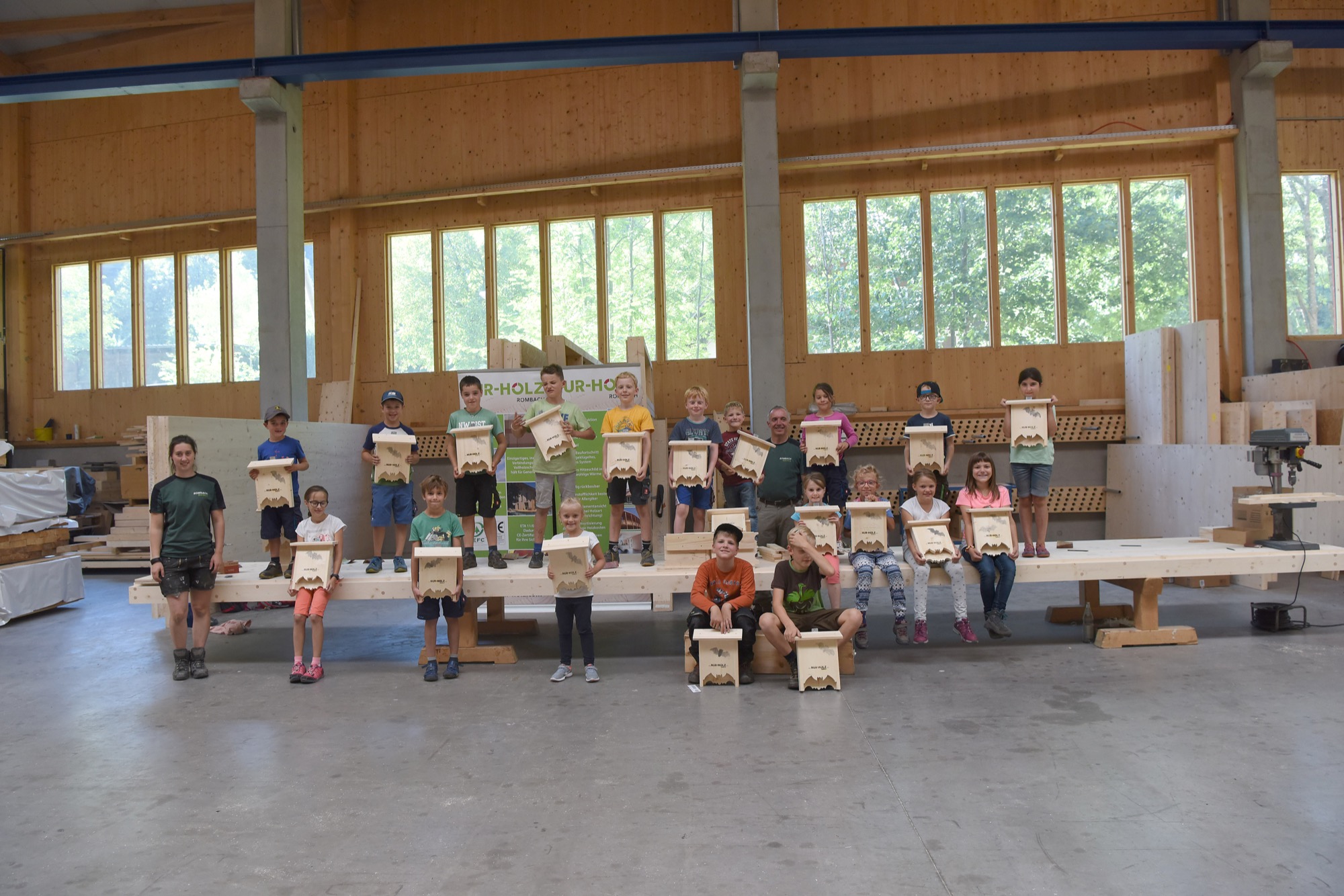 19 Kinder kamen in das Unternehmen Rombach zur Besichtigung der Firma. Nach einer kindgerechten Führung durch die Produktion folgten die praktischen Aufgaben. In diesem Jahr wurde mit den „jungen Handwerkern“ ein Fledermauskasten gebaut. Zuerst mussten an den vorgefertigten Holzteilen die Kanten geschliffen und unter Anleitung Löcher gebohrt werden. Im Anschluss durften die Kinder die Einzelteile zusammenschrauben und die Kästen bemalen. Alle waren mit sehr viel Spaß und Begeisterung bei der Arbeit und freuten sich riesig über ihren selbst gebastelten Unterschlupf für die Fledermäuse. Nach einer kleinen Stärkung gingen die Kinder stolz mit ihren Fledermausquartieren nach Hause.