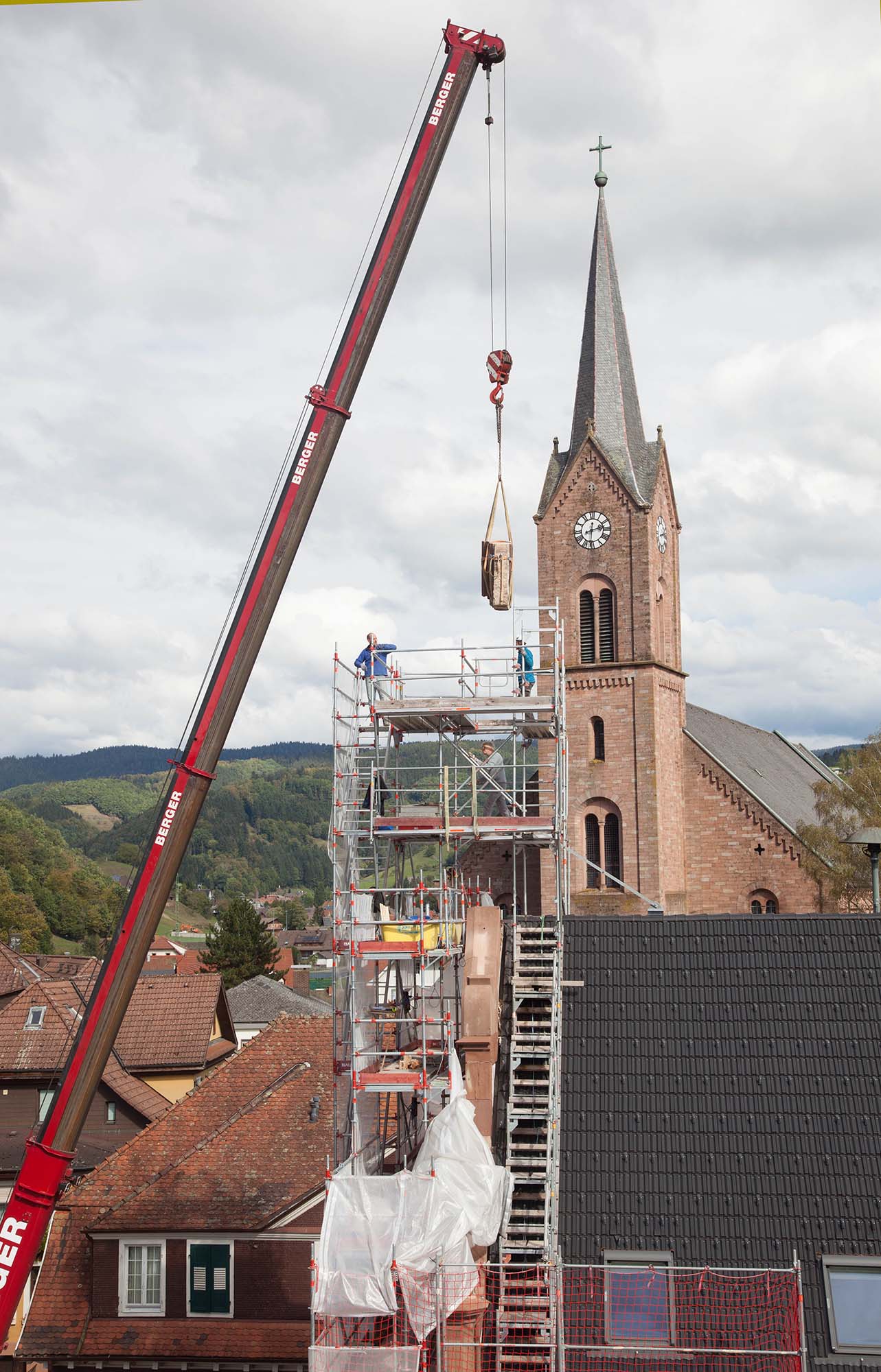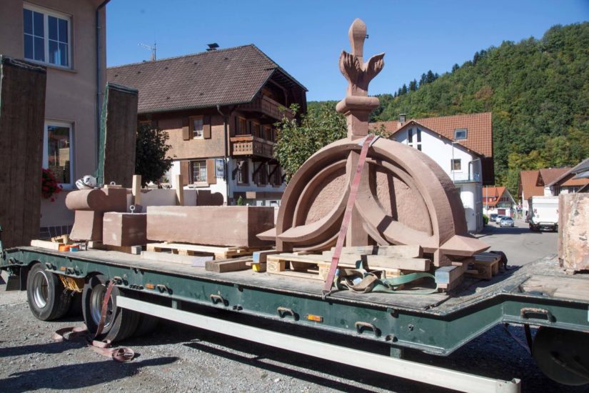 Die Firma »Jogerst Steintechnologie« in Oberkirch wird einige Teile sanieren, mehr als drei Viertel des Giebels werden anhand des Originals aus Schramberger Sandstein neu gefertigt. Dazu sind etliche Kubikmeter in Oberkirch angeliefert.