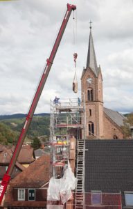 Schweres Gerät ist auf dem Rathausplatz aufgefahren. Ein Kran hilft bei der Demontage der Einzelteile. Der größte Block, der auf Firsthöhe den Schlussstein mit der Kreuzblume getragen hat, wiegt an die zwei Tonnen. Rund zwei Dutzend Einzelteile mit jeweils mehreren hundert Kilogramm stehen auf der Liste, die jetzt nach und nach abgenommen werden Kranführer Stefan Vanderlich richtet seinen Blick ständig nach oben. Millimeterarbeit ist gefordert, um von unten die Arbeiten auf dem Gerüst zu unterstützen. Ständig folgt er den Anweisungen von oben, um den Haken mit Ketten und Gurten an die richtige Position zu dirigieren. Auf dem Gerüst sind Stefan Schnakenwinkel und Ulrich Sälzle damit beschäftigt, die schweren Sandsteinteile vom Mauerwerk zu lösen und für den Abtransport am Haken zu sichern. Wenige eindeutige Handzeichen reichen für die Verständigung mit dem Kranführer, um die riesigen Brocken sicher zum Boden zu bringen. Dort warten Marc Gauthis und Anna Schindler, um die demontierten Teile auf einem Tieflader für den Abtransport festzuzurren.