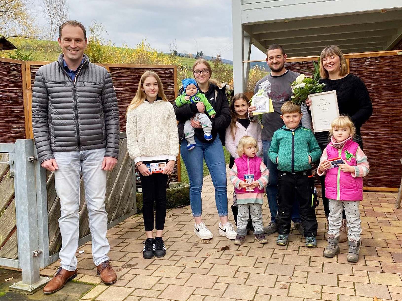 Bürgermeister Richard Weith gratulierte der Familie Lehmann zur Geburt ihres 7. Kindes und überbrachte das Patengeschenk von Bundespräsident Frank-Walter Steinmeier. Foto: privat