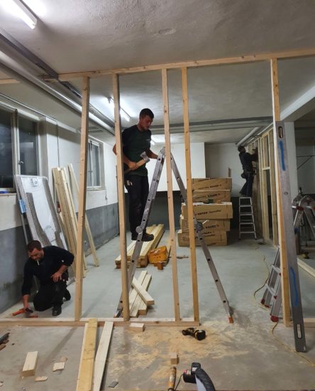 Zunftrat Lukas Spitzmüller nahm die Planung und Umsetzung als gelernter Zimmermann unter seine Fittiche. Unterstützung erhielt er dabei von seinen Zimmermannskollegen und Hästrägern Jan Beiner und Matthias Hug. Ebenso unterstützen die Zunfträte Lothar Killig, Sven Hug und Häsvogt Frank Burger die drei Zimmermänner. So wurden in mehreren Arbeitseinsätzen mit wechselnder Besetzung neue Wände im ehemaligen Fahrradkeller der Schule gestellt, gedämmt und gestrichen. Zudem mussten Sockelleisten und Elektrik verlegt sowie Kleiderstangen für die vielen Häs angebracht werden.