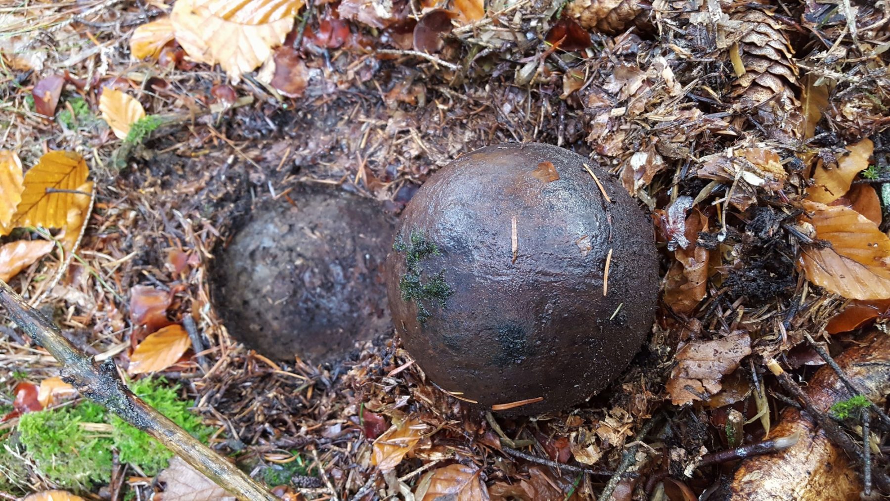 Eine junge Oberharmersbacherin ging im November 2018 nahe der Löcherbergstraße in den Wald, um dort – wie schon häufiger – nach Pilzen zu suchen. Dabei hätte sie beinahe den runden Gegenstand zwischen Laub und Gras übersehen. Den fotografierte sie dann, ließ die Kugel aber liegen.