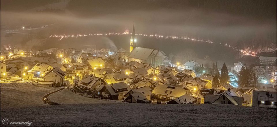 Mit dem Lied »Zu Bethlehem geboren« wurde dann auf den Höhepunkt des Abends hingeleitet: der Beleuchtung des kompletten Motivwegs »Märchen durch die Weihnachtszeit« zwischen dem Startpunkt »Am Schrofen« und dem Ende beim Jedensbachhof. Aus der Ferne als rotes Lichtband erkennbar, kann auf dem etwa zwei Kilometer langen Rundweg bis zum 6. Januar 2021 an verschiedenen Stationen die Geschichte »Die kleine Hexe feiert Weihnachten« (erschienen im Oettinger Verlag) erlebt werden. Tagsüber sorgt seit gestern etwas Schnee für weihnachtliche Stimmung – zwischen 16 und 20 Uhr erledigen diese Aufgabe viele bunte Strahler von WVT Veranstaltungstechnik. »Oh du Fröhliche« tönte es anschließend aus der Trompete von Felix Huber, der nun dem Duo »Maxi & Luisa« sowie Sonja Himmelsbach das Mikrofon übergab. Bis 19 Uhr klangen stimmungsvolle, weihnachtliche Lieder ins Tal, ins Hademardorf und auf den Märchenweg. Echte Seelenwärmer für die Spaziergänger, was bei den eisigen Temperaturen des ersten Advents sicherlich sehr gut tat.