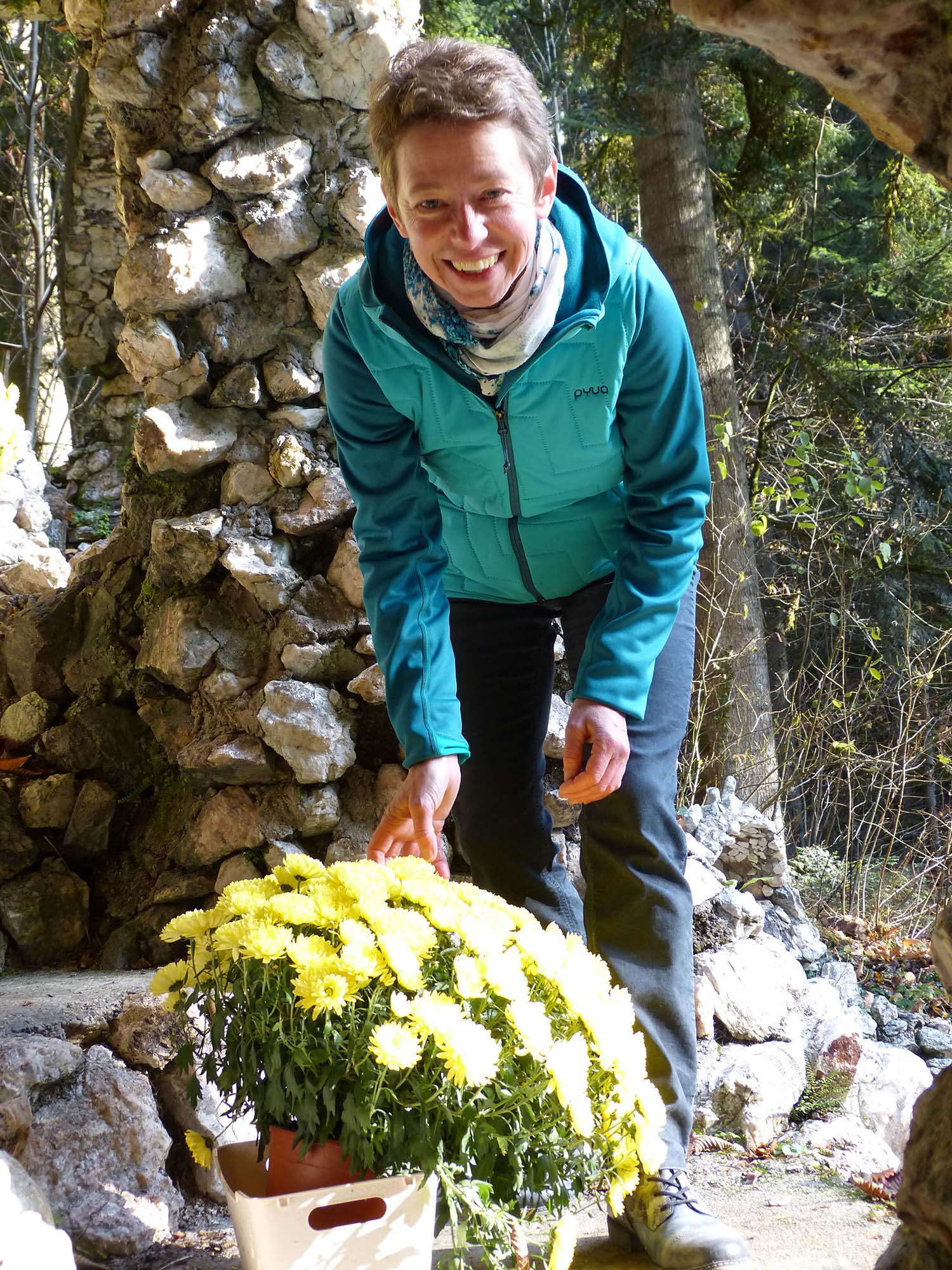 Die derart Gelobte sieht das in ihrer Bescheidenheit so jedoch ganz und gar nicht. Schließlich sei das »unsere Grotte«, betont die 51-Jährige mit Blick auf die Familie. Im Sommer in der Regel einmal täglich besucht die gelernte Hauswirtschafterin, die als Köchin das Zeller Kapuzinerkloster versorgt, das Denkmal – meist gegen Abend, nach der Arbeit. Blumengießen und damit Wasserschleppen ist dann angesagt, sachte plätschert eine gefasste Quelle am Fuße der Grotte. Doch auch Verwelktes gilt es regelmäßig zu entfernen, zu düngen, sowie regelmäßig das zu entfernen, »was vom umstehenden Wald von oben reinkommt«. Laub also muss gefegt und vom Wind verstreutes Geäst eingesammelt werden – und manchmal auch Müll in Form von beispielsweise Pizzaschachteln, den stets Willkommen geheißene – und früher gar in Bussen angereiste – Besucher in der abgelegenen Idylle leider hinterlassen. »Im Allgemeinen, muss ich sagen, ist es aber sauber dahinten«, betont Eugenia Lehmann mit ihrer ruhigen, warmen Stimme.