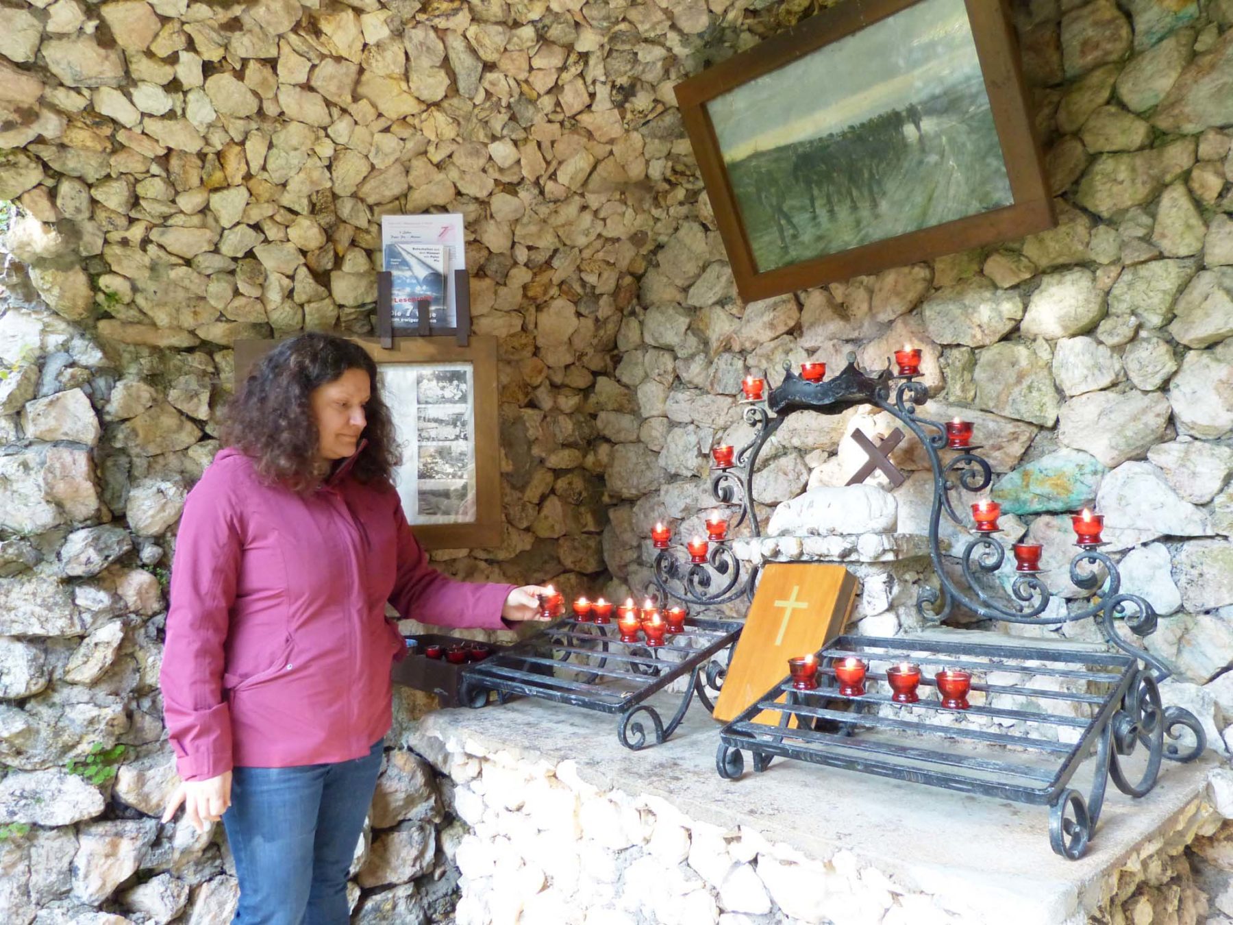 Und sie weiß: Auch aus dem Tal und der Umgebung kommen noch immer viele Menschen mit ihren Sorgen hierher an diesen abgelegenen Rückzugsort und zünden Kerzen an, zum Beispiel für Bekannte oder Verwandte. Und: »Seit Corona kommen vermehrt auch wieder jüngere Besucher, nicht mehr nur ältere.« Wenn die Grotte des Abends von vielen Kerzenlichtern erleuchtet ist, »dann weiß man, es waren über den Tag verteilt viele Leute da –das ist schön.« Alljährlich im August, zu Mariä Himmelfahrt, führt zudem eine Lichterprozession hierher.