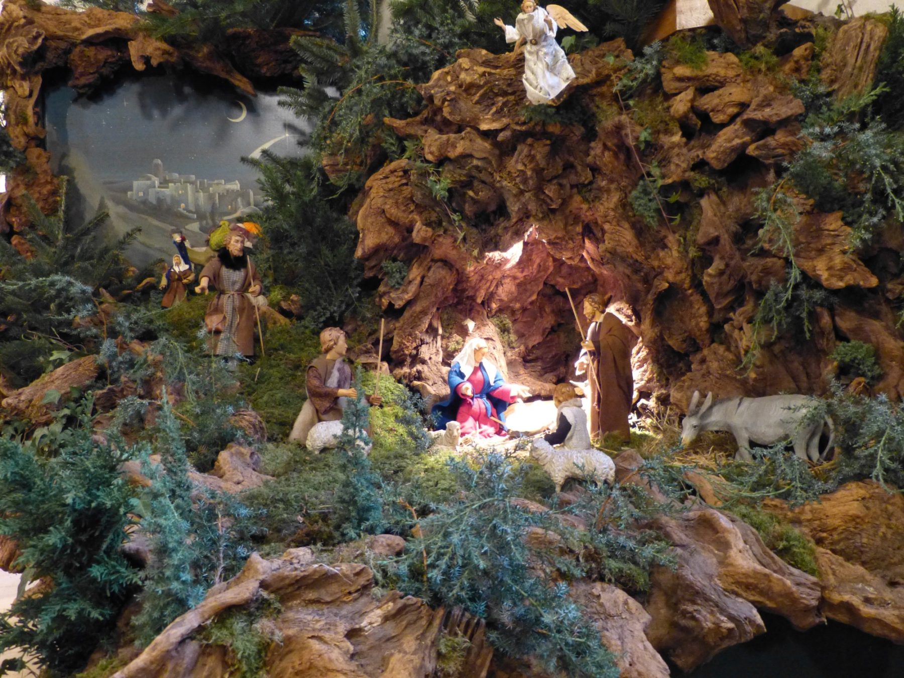 Schließlich ist der Feinschliff an der Reihe: Das Ganze wird mit Efeuranken sowie mit immergrünen Zweigspitzen geschmückt, die wie Bäumchen und Gebüsch in einer Wurzellandschaft wirken, über der ein ehrwürdiger Engel schwebt. Dann endlich können die vielen Krippenfiguren einziehen. Ein von dem inzwischen verstorbenen ortsansässigen Kunstmaler Berthold Roth gefertigtes Hintergrundgemälde vervollständigt das opulente Werk.