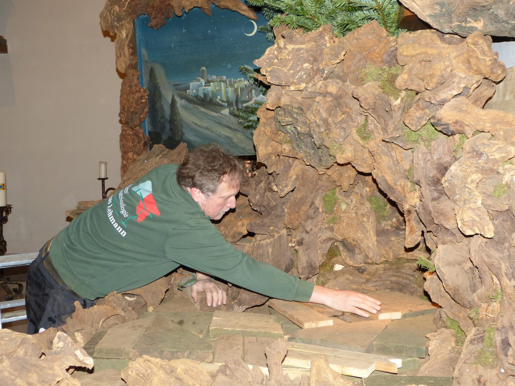 Die ersten 10 bis 15 Jahre baute Thomas Lehmann die Krippe von Mal zu Mal »komplett neu zusammen«, volle drei Arbeitstage nahm das jeweils in Anspruch. Dann aber schraubte er zumindest die (im Übrigen stimmungsvoll beleuchtete) Höhle, in der die Heilige Familie Schutz findet, als komplettes Element fest ineinander. Noch besser wäre es, gesteht der Mann mit der besonderen Liebe zu Altholz, wenn man die Krippe auf Dauer komplett aufgebaut lassen und im Ganzen transportieren könnte, doch das lässt die Türöffnung der Kapelle nicht zu: Die ist schlichtweg zu klein.