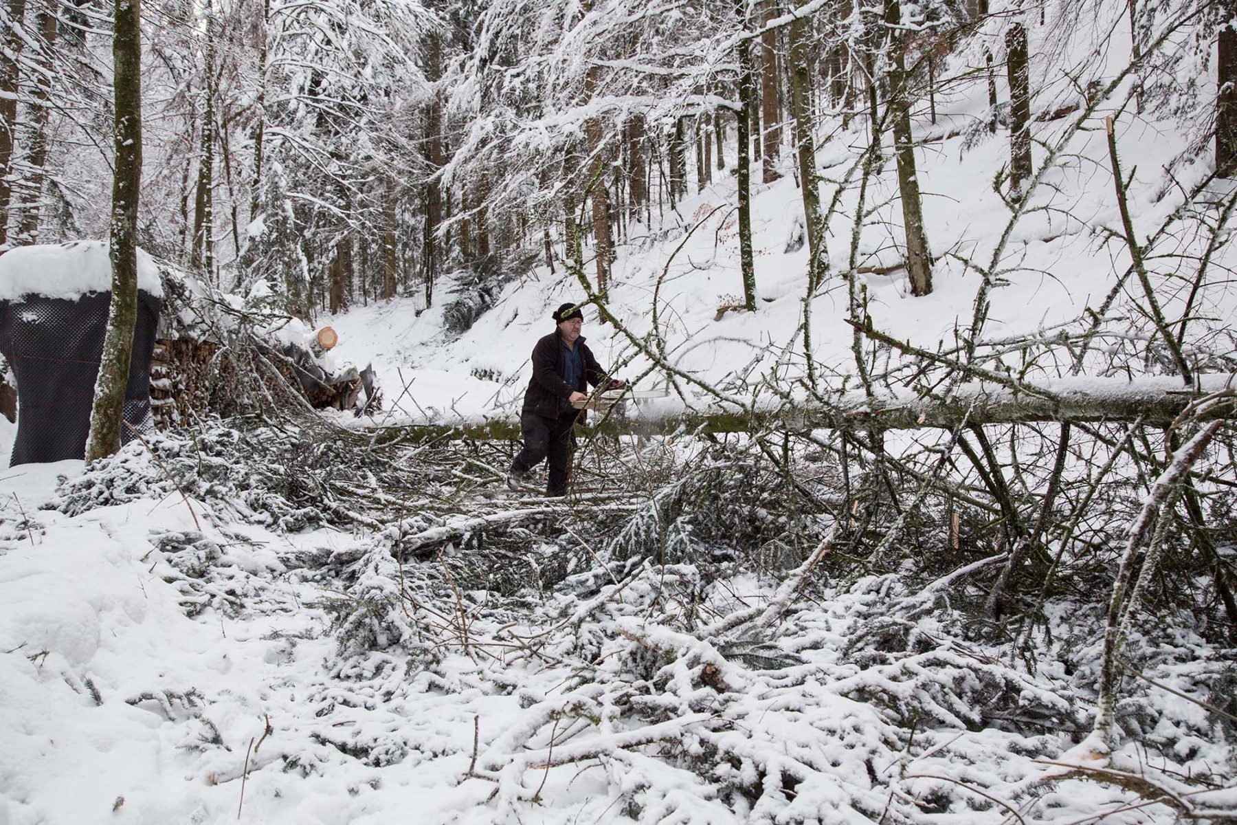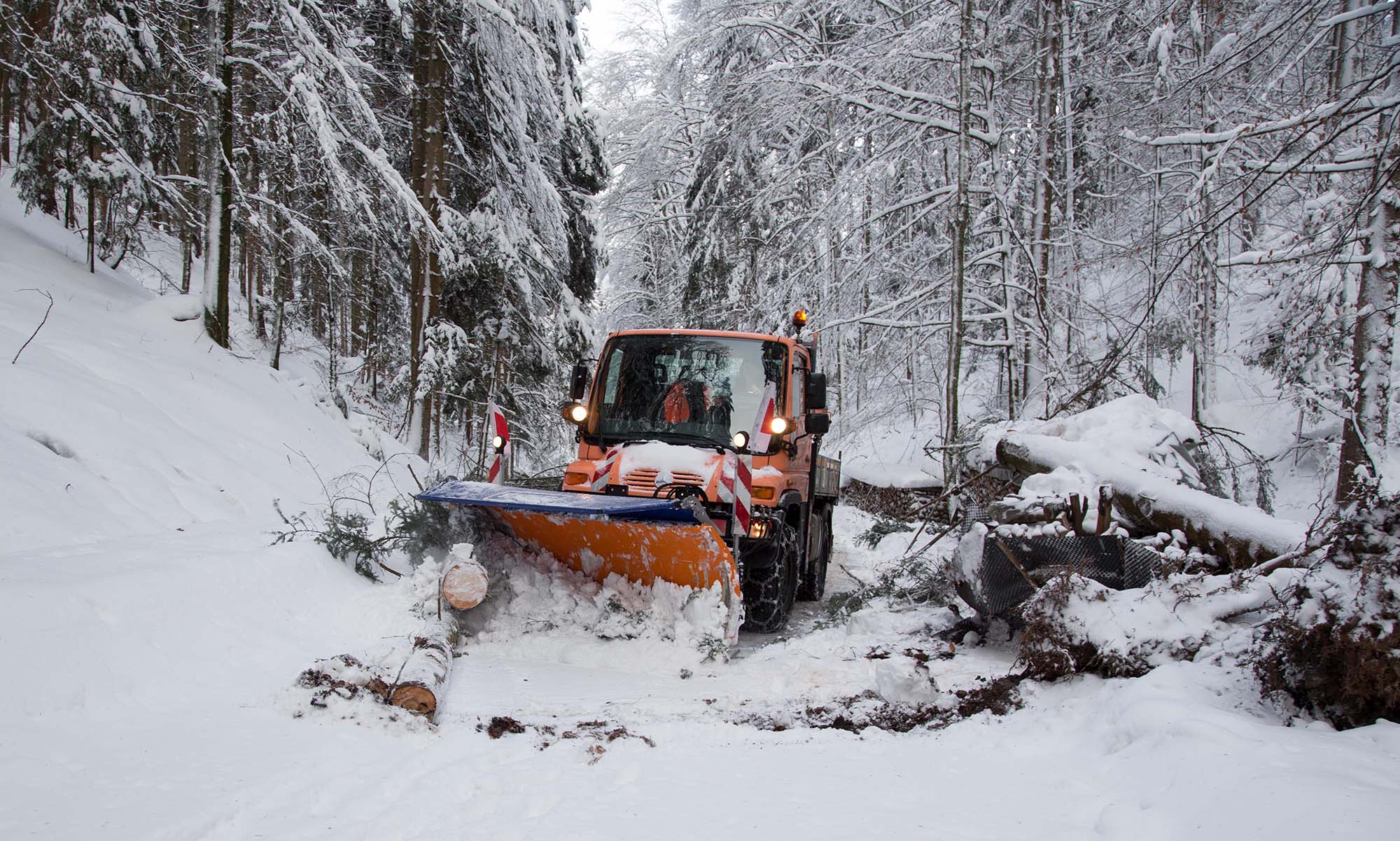 Er weiß, welche Überraschungen die Jahreszeit bringen kann, vor allem, wenn er an die Touren auf den Oberharmersbacher Hausberg denkt. Unter zweieinhalb, drei Stunden läuft diese Tour nicht, besondere Hindernisse nicht eingerechnet. Recht harmlos sieht es am Freitagmorgen aus, trotz des gefallenen Neuschnees. Unterhalb der Abzweigung zum Gewann Durben blockiert eine entwurzelte Fichte die Weiterfahrt. Ein musternder Blick, zwei Schnitte am Stamm, einige Äste absägen, den Rest erledigen 170 PS des Unimogs, der dank gekonnter Führung das Restholz an den Wegrand schiebt.