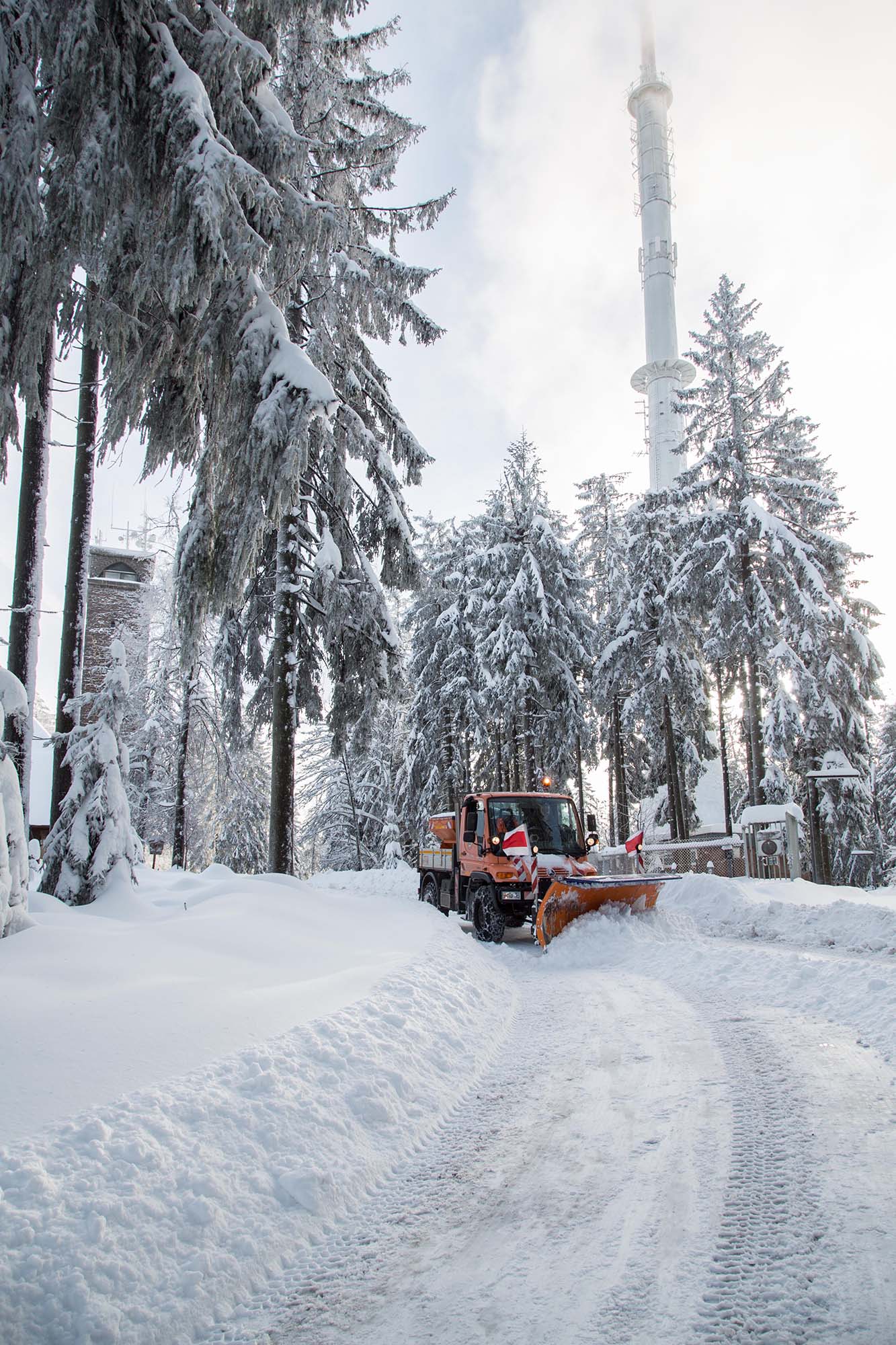 Der scharfe Ostwind hat die mit Schnee beladenen Fichten etwas entlastet, dennoch klopft immer wieder der eine oder andere Ast an das Führerhaus des Unimogs. Oben beim Aussichtsturm ist nur das monotone Geräusch des Windrades zu hören. Weiße Fahnen aus feinen Eiskristallen treibt der Ostwind unablässig über den Brandenkopf. Thomas Furtwengler hat im Moment keinen Blick für die winterstarre Umgebung, die sich in der Morgensonnen von ihrer besten Seite Zeit. Er muss sich auf seine Arbeit konzentrieren und räumt zügig den Platz vor dem Wanderheim.