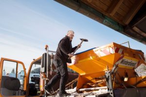 Talwärts werden die letzten Feinheiten der Räumung abgeschlossen. Ein kurzer Halt beim Bauhof, nicht er, aber der Unimog wird »gefüttert«, mit Streusalz, und schon sind Thomas und sein Gefährt wieder auf Achse.