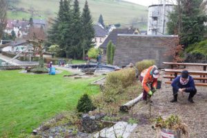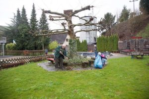 Unterstützt von Fachkräften für Forstarbeiten und Baumschnitt galt beim ersten Arbeitseinsatz die Aufmerksamkeit vorab den Grünanlagen. Obwohl das Wetter keineswegs zum Baden einlud, schienen die Mitglieder des Fördervereins schon lange mit den Hufen gescharrt zu haben. Der Eifer war un gebremst: Hecken wurden zurechtgestutzt, Laub zusammengerecht, Äste der Bäume zurückgeschnitten. Fleißige Hände sammelten den Grünschnitt ein. »Besenrein« wurden die Pflasterflächen zurückgelassen, als der Arbeitseinsatz beendet und der nächste Einsatztermin geklärt war.