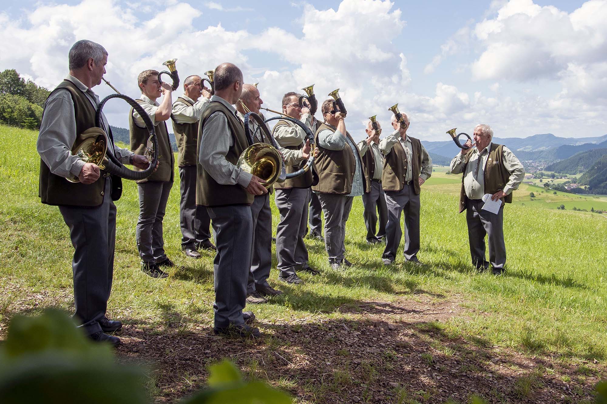 Die Jagdhornbläsergruppe Harmersbachtal wird sich an der 30 Meter langen Baumstamm-Bank auf dem Premiumweg und Schwarzwälder Genießerpfad »Harmersbacher Vesperweg« platzieren und ihre Jagdhornklänge ins Tal schicken. Dieses außergewöhnliche Fleckchen Erde mit fantastischer Aussicht erreicht man nach dem ersten, ca. zwei Kilometer langen, Anstieg.
