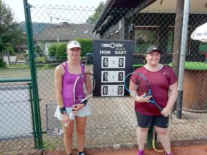 Den Anfang machte das Damen Einzel. Hier standen sich Kristin Lehmann und Laura Broß gegenüber, die sich in der Gruppenphase beiden souverän durchsetzen konnten. Die Favoritin und Vorjahressiegerin Kristin Lehmann übernahm von Beginn an das Heft des Handelns und versuchte Laura Broß mit schnellen Grundschlägen unter Druck zu setzen. Nach einem ganz knappen ersten Spiel, das mehrmals über Einstand ging, gelang ihr das auch immer besser. Zwar unterliefen ihr immer wieder ein paar zu einfache Fehler, doch Laura Broß fand einfach kein Mittel gegen die guten und schnellen Schläge von Kristin Lehmann. So dauerte es nicht lange und Satz 1 ging hochverdient mit 6:0 an die Favoritin. Doch Laura Broß gab sich nicht auf und kämpfte trotz der heißen Temperaturen um jeden Punkt, um sich zumindest noch ein paar Ehrenpunkte zu sichern. Dies gelang ihr Mitte des zweiten Satzes, jedoch war Kristin Lehmann an diesem Tag gnadenlos und zog ihr Spiel weiter durch. Nach einer guten Stunde Spielzeit war es dann soweit und Kristin Lehmann sicherte sich mit 6:0 und 6:1 zum wiederholten Male souverän den Clubmeistertitel im Damen Einzel. Auch die Leistung von Laura Broß war ansprechend. Sie war zwar am Ende chancenlos, gab sich jedoch nie auf und versuchte mit ihren vorhandenen Mitteln der Favoritin das Leben so schwer wie möglich zu machen.