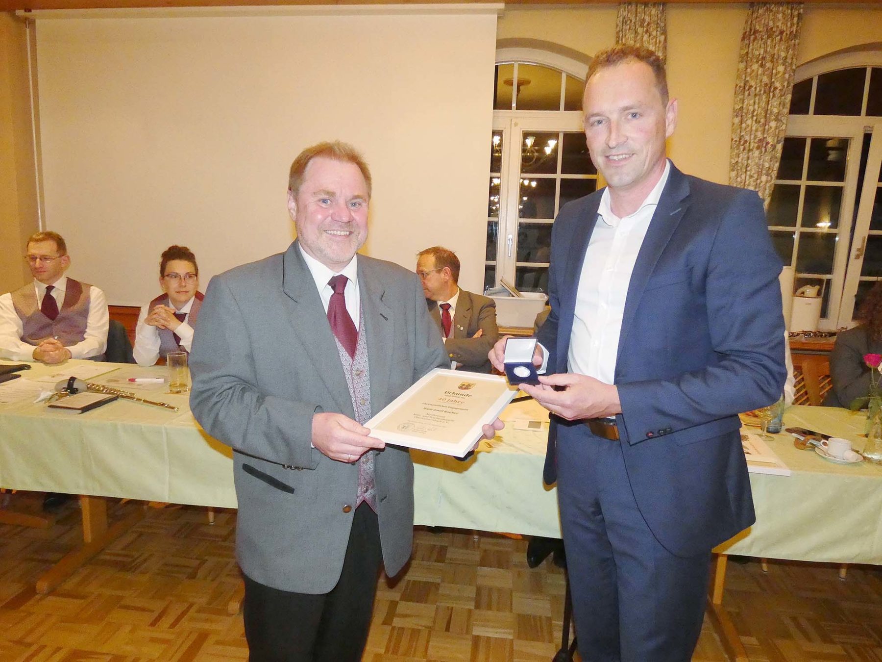 45 Jahre aktives Vereinsmusizieren: Karl-Heinz Atamaniuk (links) nahm von Michael Gutmann die Ehrung entgegen.