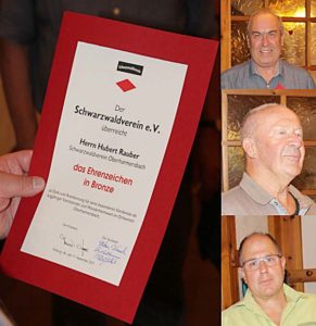 Eine Urkunde und die Ehrennadel in Bronze für besondere Verdienste im Verein erhielten Hubert Rauber, bisheriger Wanderheimwart, sowie Thomas Vollmer und Xaver Weber, die beide Mitglied des Vorsitzendenteams waren.
