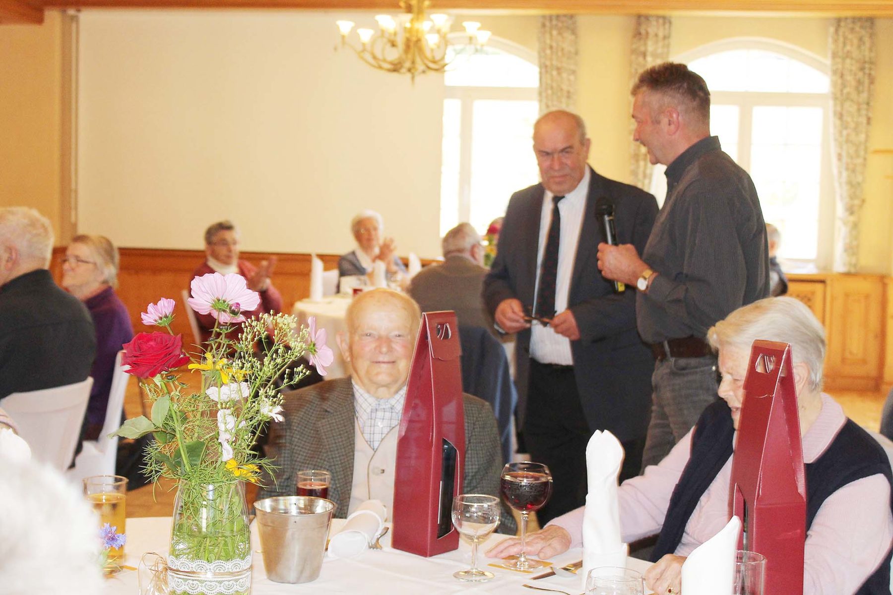 Der Tag begann mit dem Gottesdienstes um 9 Uhr in der Pfarrkirche, zelebriert von Pfarrer Gerner. Nach dem Gottesdienst waren die Seniorinnen und Senioren zum Mittagessen in den liebevoll gestalteten Stubensaal eingeladen. Der Ansprechpartner des Oberharmersbacher Altenwerks, Hubert Rauber, begrüßte die Seniorinnen und Senioren und freute sich, dass über 50 Personen gekommen waren. Bürgermeister Richard Weith war verhindert und wurde von Klaus Lehmann vertreten. Pfarrer Gerner konnte aufgrund von Firm-Vorbereitungen nicht dabei sein. Diakon Matthias Hoppe kam kurz zur Begrüßung, musste wegen Firm-Terminen aber schnell wieder weiter. Klaus Lehmann blieb länger und überreichte den zwei ältesten Personen im Saal, Edmund Lehmann mit 92 Jahren und Berta Lehmann mit 90 Jahren, ein Weinpräsent. Vor der Mittagspause erinnerte Rita Schilli mit Bericht und Bildern an die Seniorenferien vom September, Herbert Jilg sorgte für mit dem Akkordeon für Musik.