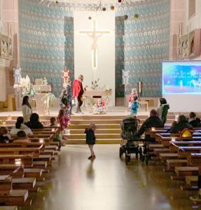 Auf einer Leinwand wurden dazu Bilder des heiligen St. Martin gezeigt. Am Ende der Feier hatte jedes Kind am Ausgang das traditionelle Martinsgebäck überreicht bekommen, welches von der Gemeinde und Volksbank gespendet wurde. Anschließend konnte noch jede Familie für sich Laternenlaufen bei Dunkelheit.