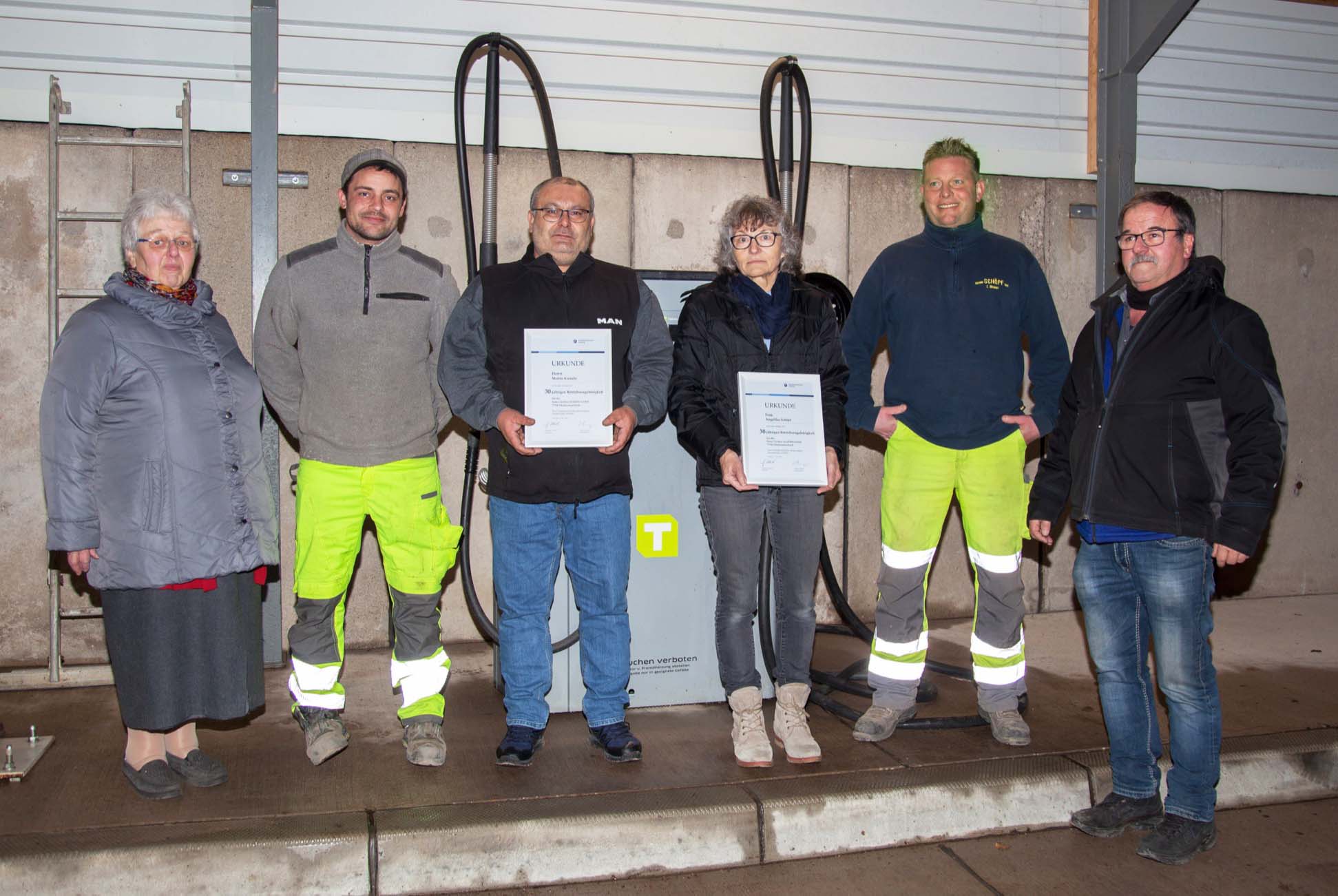 Seit 30 Jahren zählt Angelika Schöpf zur Belegschaft. Im Büro gilt sie als »Mädchen für alles« als wichtige Stütze. Ein Präsent und die Urkunde der Handwerkskammer durfte sie für ihre Verdienste entgegennehmen. Diese Auszeichnung mit einem Präsent erhielt auch Martin Kienzle, der ebenfalls seit 30 Jahren zuverlässig den Lkw lenkt oder den Bagger dirigiert.