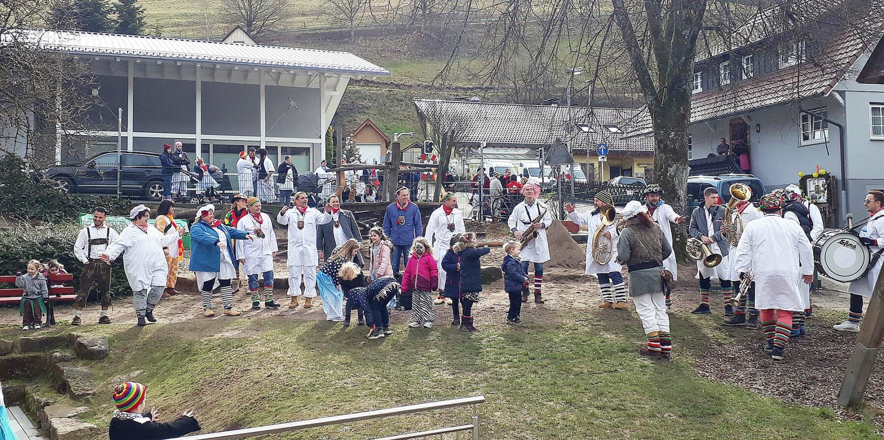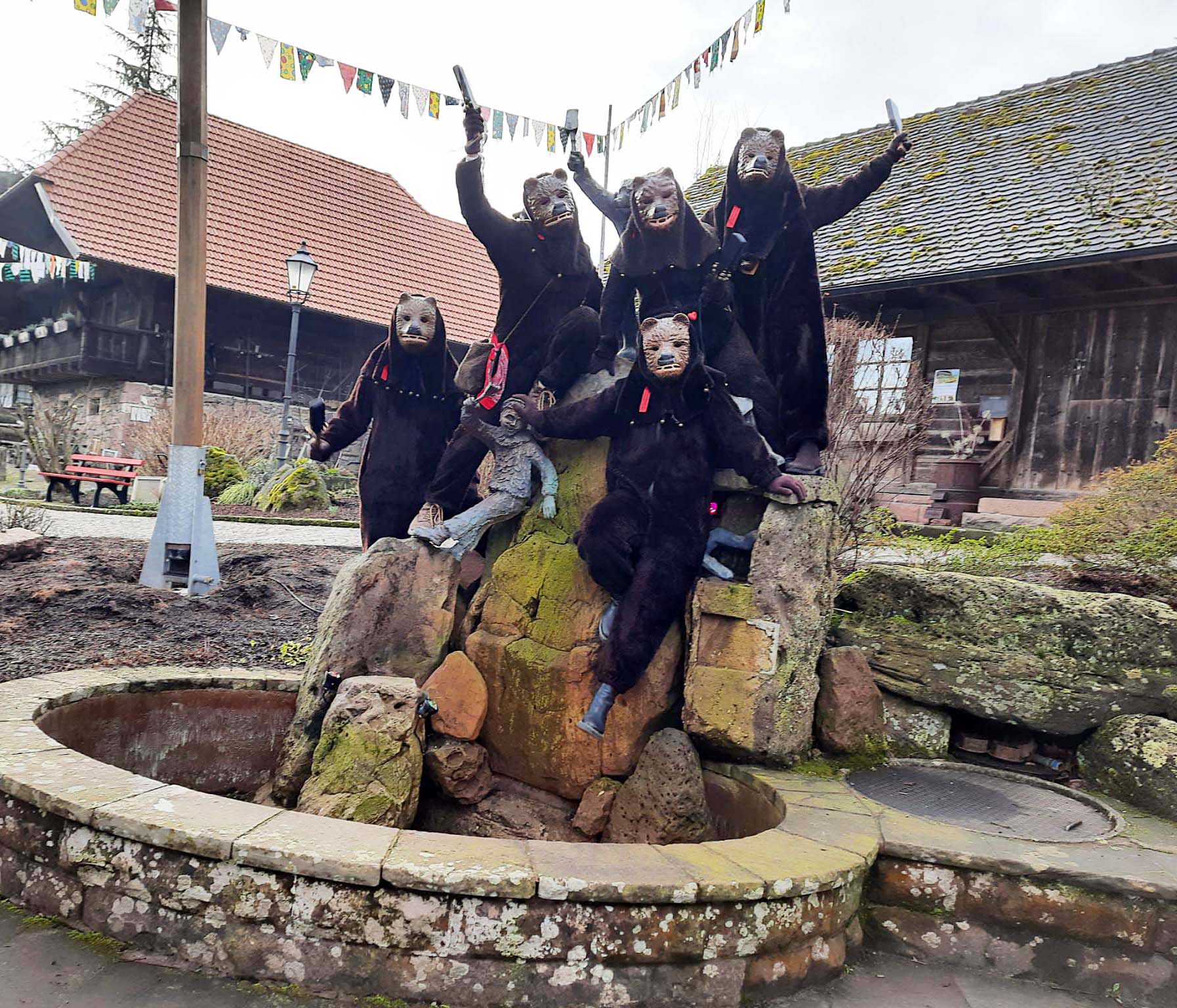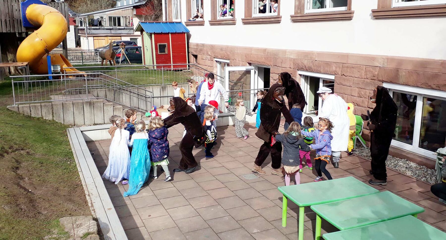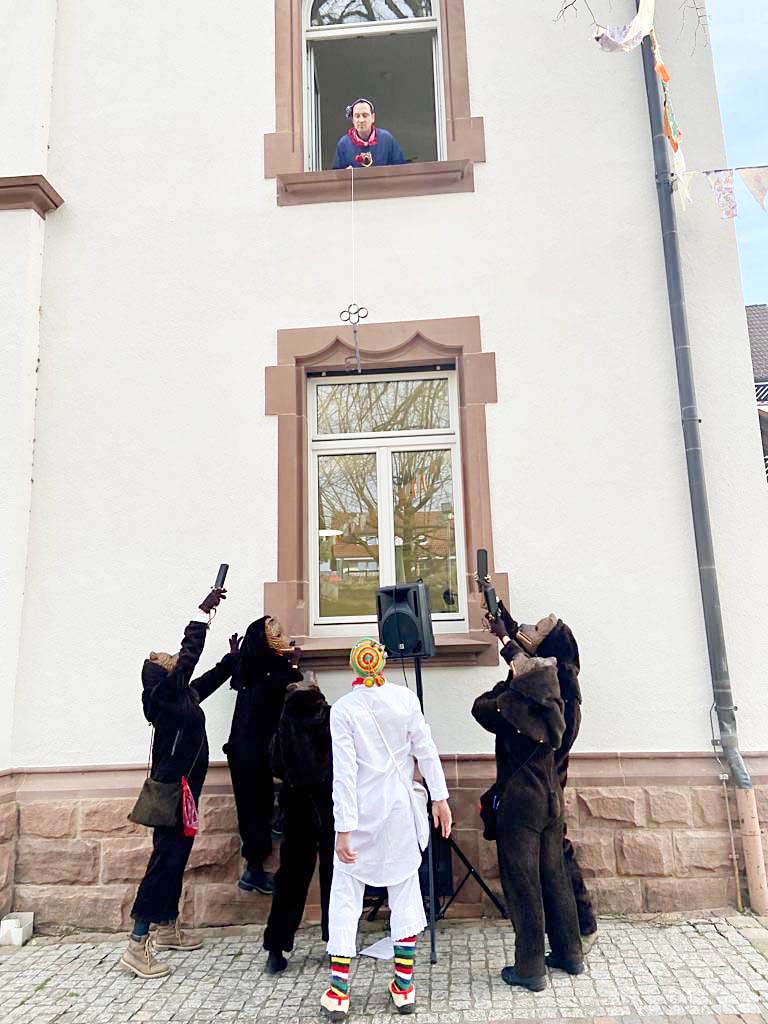 Über den »staubfreien Weg« ging es weiter Richtung Kindergarten. Auch dort ahnten die Kinder nichts. Großes Staunen und Aufregung machten sich im Kinderhaus breit, als die Musiker, Bürgermeister Richard Weith, Zunft rat und Bären den Hof enterten. Die ebenfalls verkleideten Kinder feierten mit ihren Erziehern und Erzieherinnen gruppenweise an den offenen Fenstern des Hauses oder im Hof mit.
