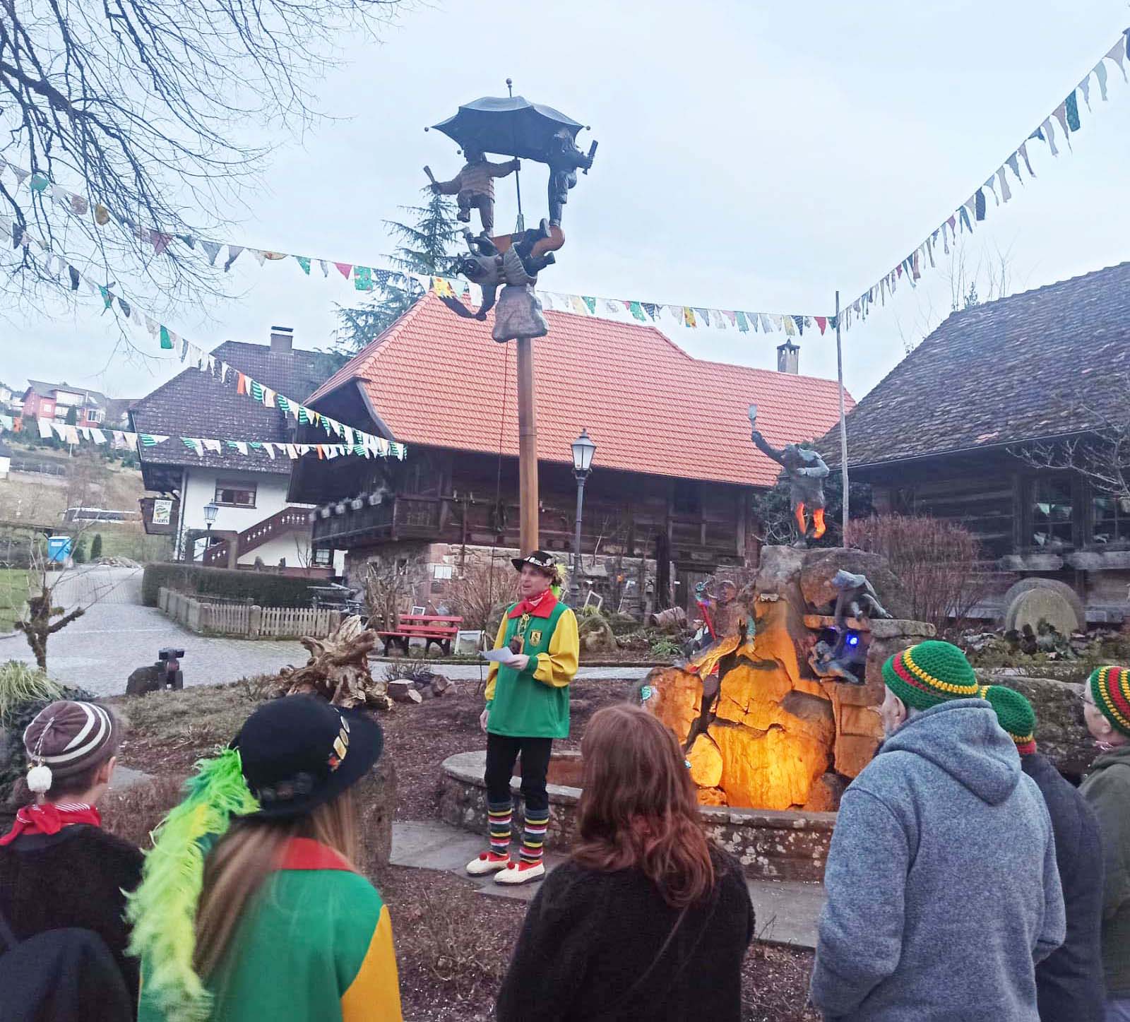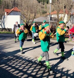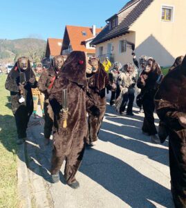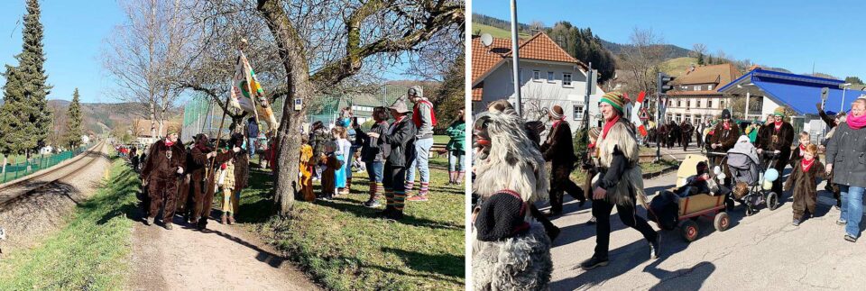 Bei strahlend blauem Himmel trafen sich Zunftrat und Hästräger der Bärenzunft, Oberharmersbacher Fasentgruppen, Musiker, kleine und große Narren sowie ein paar Hästräger befreundeter Zünfte am »Posthörnle« zu einem etwas anderen Fasentmändigsspaziergang. Um 14.11 Uhr setzte sich der fröhliche Zug angeführt vom Zunftrat und dem Narresume der Bärenzunft in Richtung Dorf in Bewegung. Sogar einige Zuschauer säumten unterwegs den »Staubfreien« Weg. Da freuten sich die jüngsten Hästräger, da sie fleißig ihre Gummibärle verteilen konnten.