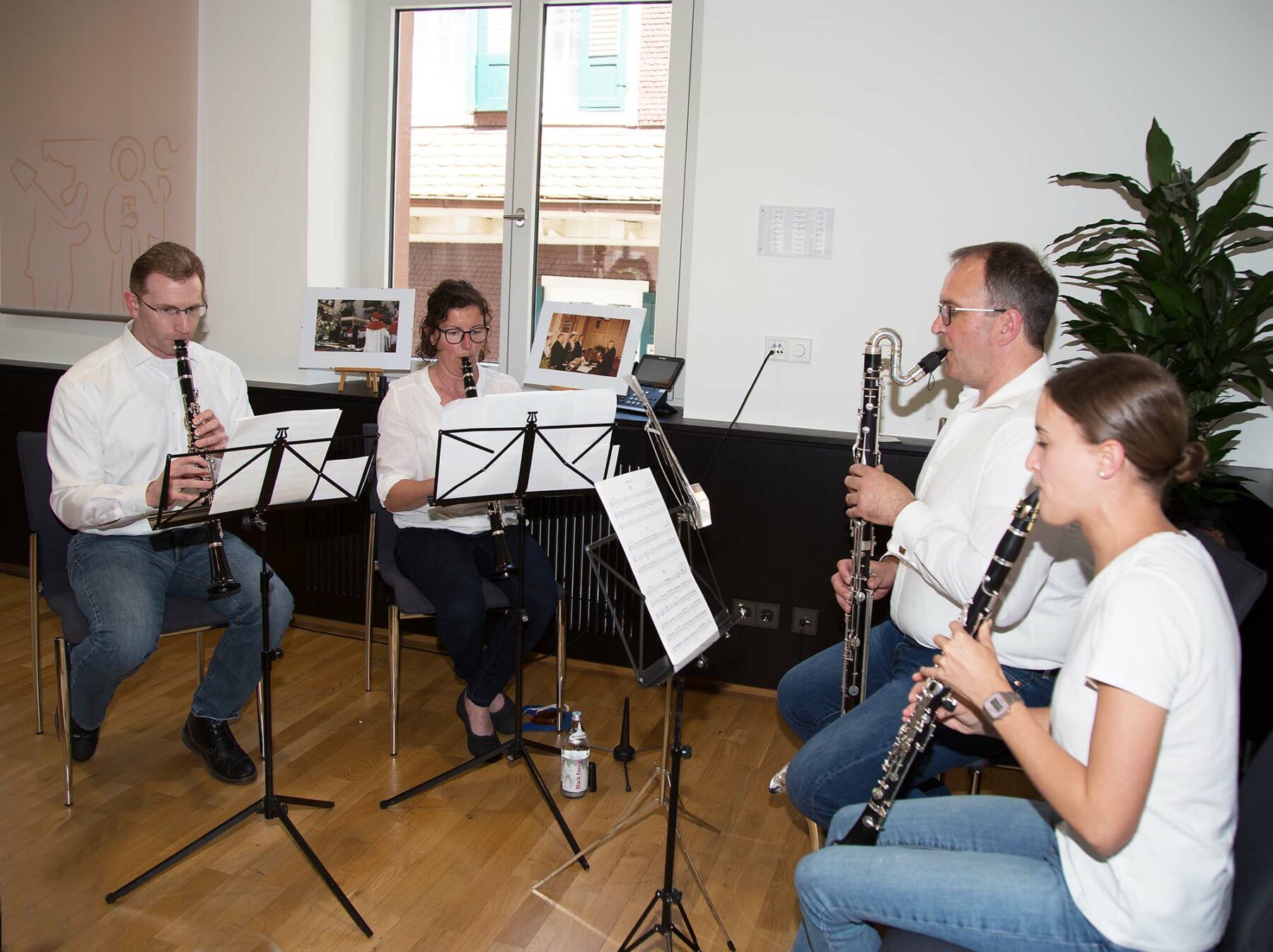 Der neu gestaltete Bürgersaal diente als Forum für die Feierstunde mit den geladenen Gästen. Vertreter der ausführenden Firmen und der beteiligten Behörden, Mitarbeiter des Bauhofs, die Belegschaft des Rathauses, Vertreter der Nachbargemeinden und der Gemeinderat sowie Alt-Bürgermeister und Ehrenbürger Otmar Ritter und Altbürgermeister Siegfried Huber waren der Einladung zur offiziellen Einweihung gefolgt. Ein Klarinettenquartett der Miliz- und Trachtenkapelle (Stephanie Fritsch, Sophia Stange, Tobias Fritsch, Michael Schneider) verlieh der Feierlichkeit einen würdigen Rahmen.