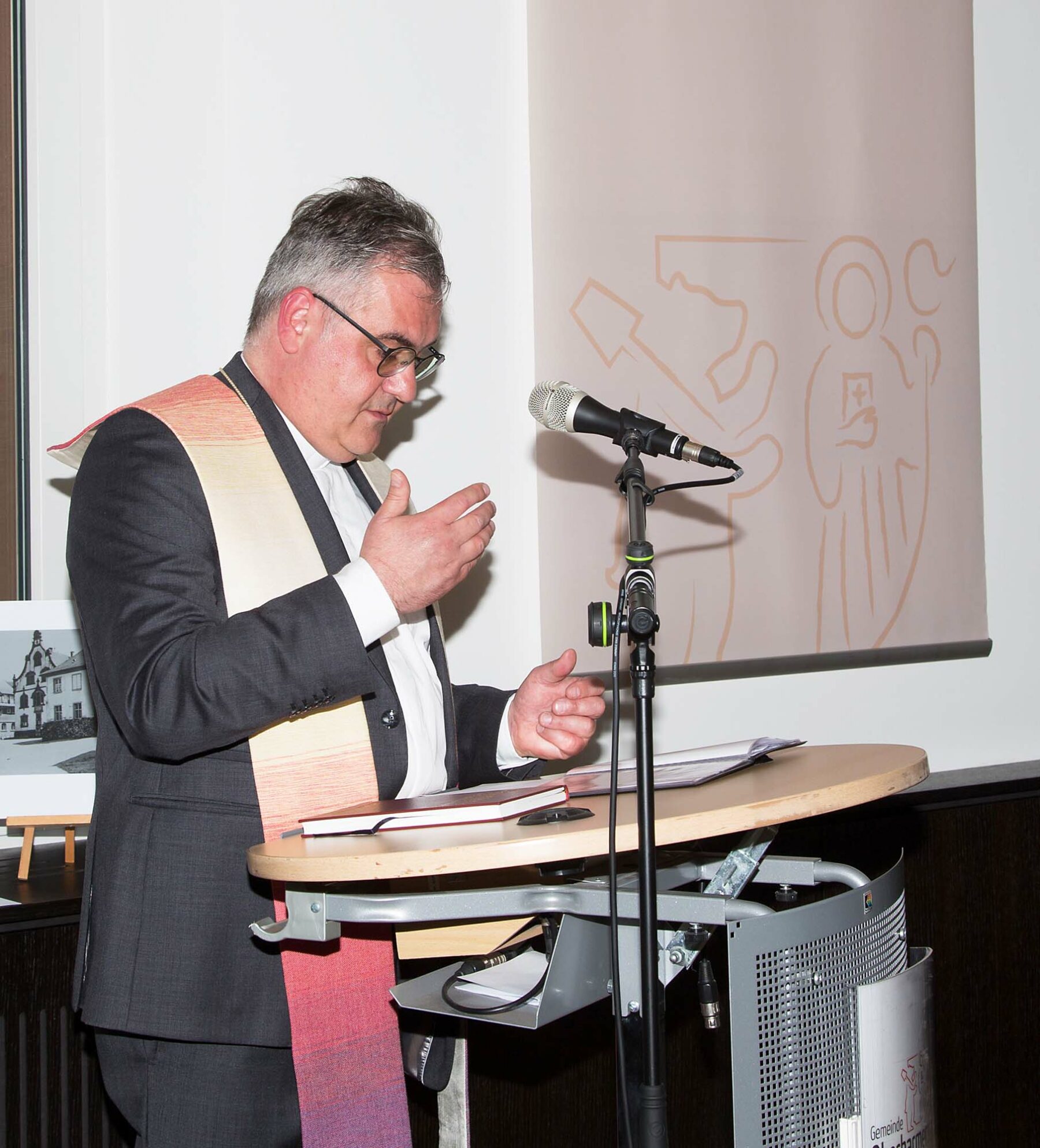 Die Segnung der jetzt neu gestalteten Räume blieb Pfarrer Bonaventura Gerner vorbehalten. Zitate aus der Bergpredigt sollten an das »Grundsatzprogramm« des Neuen Testaments erinnern. »Dies soll auch Maßstab für das Handeln im Rathaus für die hier lebenden Menschen sein« wünschte er sich. Mit den Fürbitten, die das Leid der Menschen in der Ukraine einschlossen und dem gemeinsam gebetenen Vater Unser erteilte Pfarrer Gerner dem Gebäude den kirchlichen Segen.