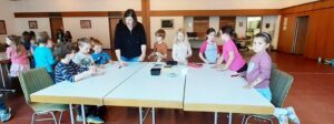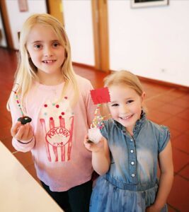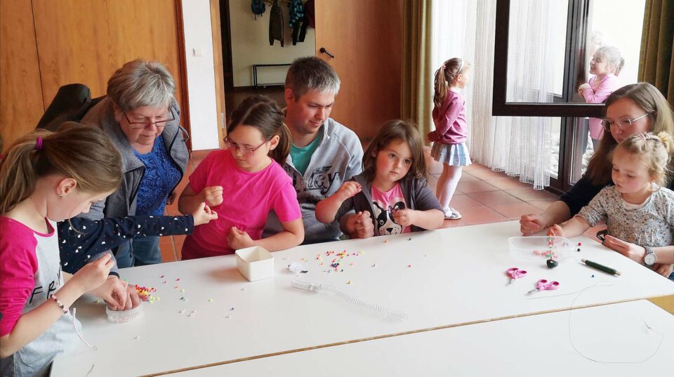 Es wurden Steine bemalt, dann verschiedene Perlen auf Draht aufgefädelt und zum Schluss noch ein Kärtchen gestaltet. Somit entstand ein dekorativer Kartenhalter. Sogar eingepackt haben fast alle Kinder ihre Werke selbst, es haben sich alle gegenseitig geholfen.
