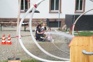 Mit einem schattigen Plätzchen lockten Elternbeirat sowie das Team vom Kinderhaus »Sonnenblume«, unterstützt von den Eltern, die Gäste. Den Erlös werden die Initiatoren der neu geplanten Naturerlebnisgruppe spenden. Kaffee und Kuchen, ein kühles Getränk und eine heiße Wurst als Wegzehrung fanden viele Abnehmer. Für die künftigen kleinen Rathausbesucher bot die Jugendfeuerwehr Abwechslung beim »Spritzer-Wettbewerb. Die Touristinfo war ebenfalls mit einem Stand vertreten.