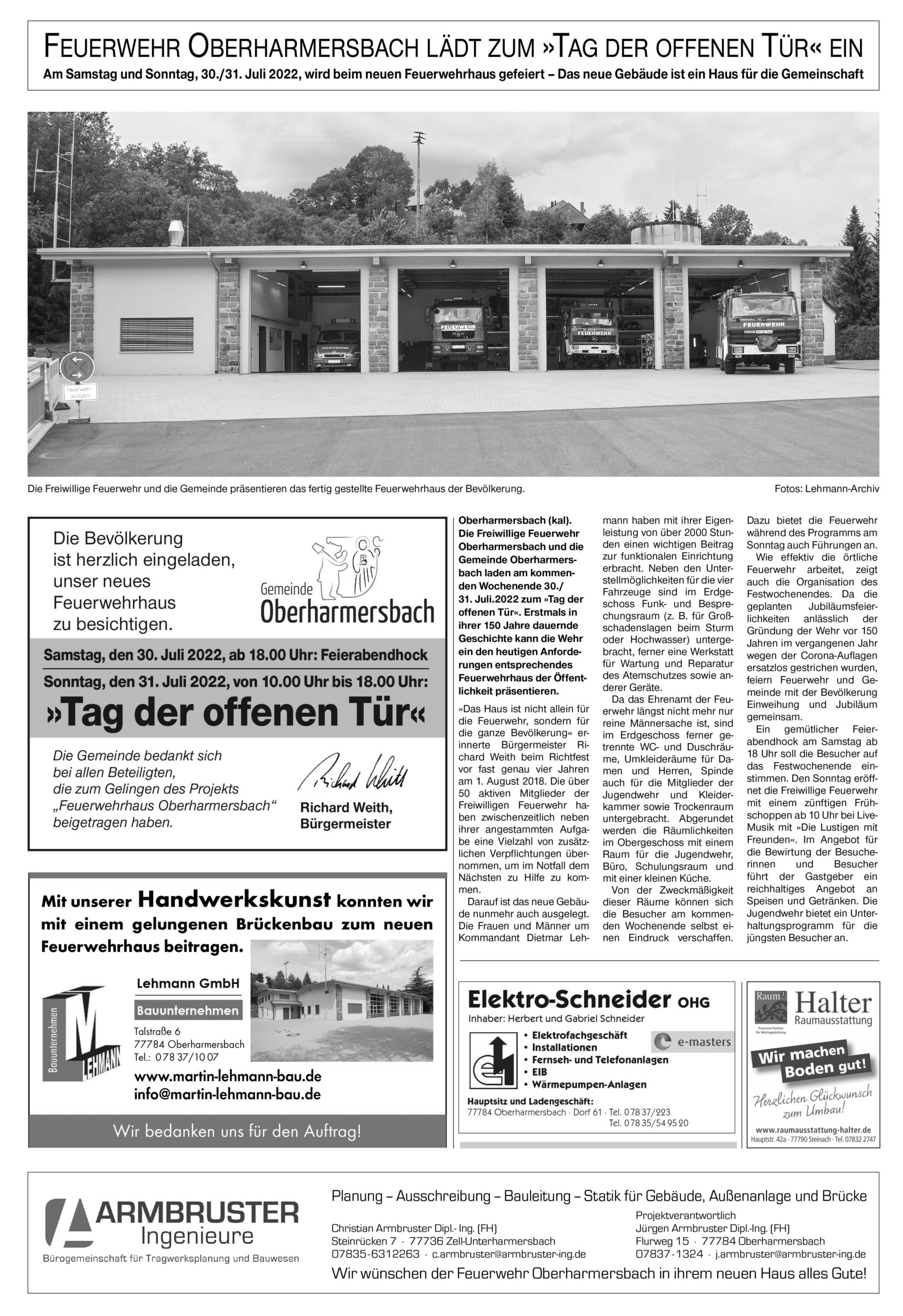 - Anzeige -Anzeige, Oberharmersbach | 27.07.2022 Feuerwehr Oberharmersbach lädt zum »Tag der offenen Tür« einAm Samstag und Sonntag, 30./31. Juli 2022, wird beim neuen Feuerwehrhaus gefeiert – Das neue Gebäude ist ein Haus für die Gemeinschaft Foto:Die Freiwillige Feuerwehr und die Gemeinde präsentieren das fertig gestellte Feuerwehrhaus der Bevölkerung. Foto: Lehmann-Archiv von Feuerwehr Oberharmersbach Das könnte Sie auch interessieren:Foto: Lehmann-ArchivKaum Lücken im VeranstaltungskalenderFoto: Jill LöfflerHarmersbacher Winterzauber trotzt Wind und RegenFoto: UnternehmenGroßzügige Spende für die Freiwillige Feuerwehr