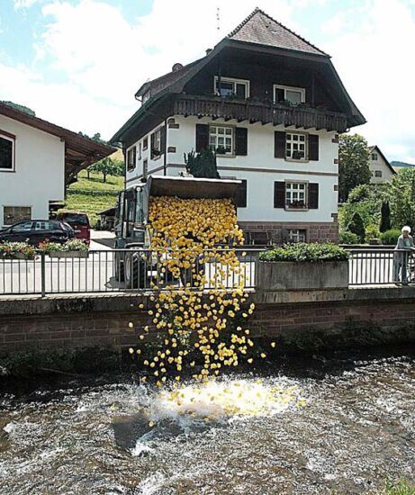»Entlich!« Nach zwei Jahren Abstinenz und scharfen Trainingswochen stürzen sich ca. 2000 »Renn-Enten« für einen guten Zweck in die Wild-/ Mildwasser-Fluten des Harmersbachs auf der wohl schönsten Enten-Rennstrecke der Welt.