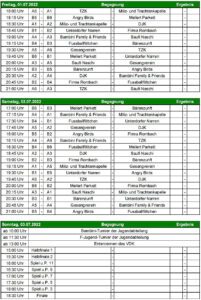 Ab 15 Uhr geht es mit dem Ortsturnier weiter und in den Halbfinalbegegnungen werden die Finalisten ermittelt. Anschließend finden die Platzierungsspiele statt und gegen 18.30 Uhr wird das Finale ausgetragen und der Sieger des Turniers wird im Endspiel ermittelt.