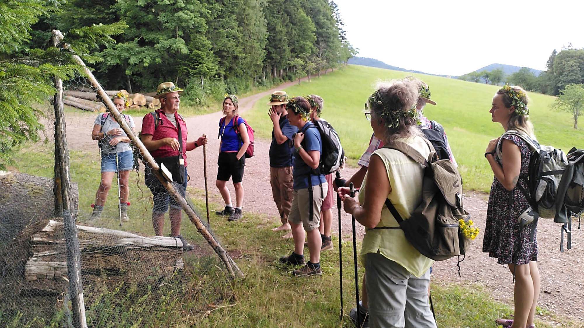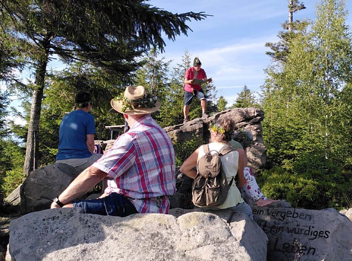 Die Sonnwendwanderung startete am Langenberg und führte zum Kreuzsattel. An mehreren Stationen wusste der Wanderführer Xaver Weber so einiges zu erzählen. Am Vogesenblick las er aus dem fürchterlichen Hexenhammer vor, was den Frauen in den düsteren Zeiten widerfuhr.
