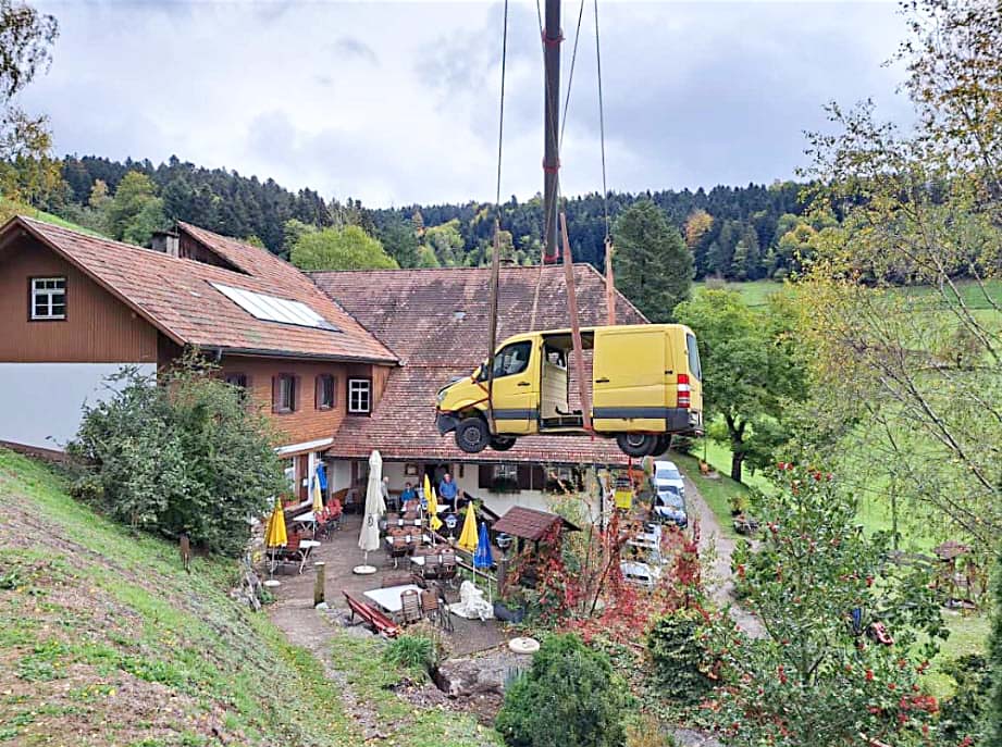 Dem Fahrer gelang es noch rechtzeitig vor dem Aufprall aus seinem Lieferwagen herauszuspringen. Dieser kam erst krachend am Rand der Außenterrasse der Vesperstube »Langenberg« wieder zum Stehen. Zum Glück hielten sich dort wegen des schlechten Wetters am Samstagnachmittag keine Gäste auf. Letztlich musste ein Kranwagen gerufen werden, der das demolierte Fahrzeug über das Dach des Bauernhofs hinweg auf die Fahrstraße hievte. An eine Weiterfahrt war aber nicht mehr zu denken.