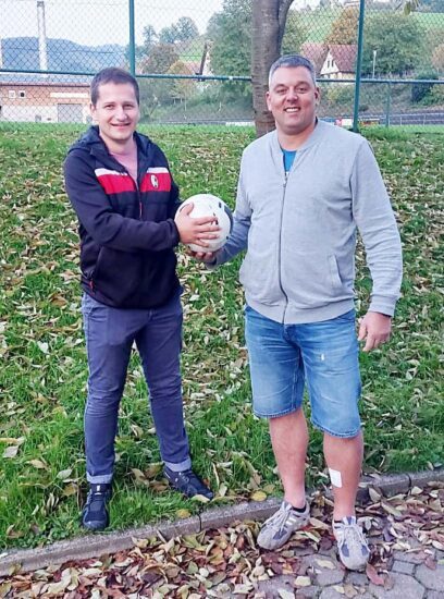 Auf dem Bild übergibt er den Spielball an SVO-Beisitzer Heiko Breig. Er hofft, dass der einheimische SVO ein Tor mehr schießt als der Gegner.