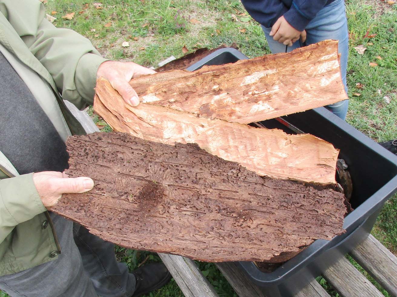 Bevor die Kinder selbst auf die Leiter steigen konnten, erläuterte ihnen Förster Lehmann den Sinn der Nistkästen. »Im Wald gibt es nicht nur nützliche Insekten, sondern auch solche, die den Bäumen schaden, z. B. den Borkenkäfer«, so der Förster. Anhand von mitgebrachten Baumrinden veranschaulichte er den Kindern, welche Schäden diese kleinen Käfer im Wald anrichten können. Vögel, vor allem der Kleiber, sind der natürliche Feind des Borkenkäfers und je mehr Vögel es im Wald gibt, desto mehr Borkenkäfer und dessen Larven werden von den Vögeln gefressen, bevor sie Schaden anrichten können. Deshalb ist es wichtig, den Vögeln einen Platz zu bieten, wo sie ungestört und sicher ihr Nest und ihre Jungvögel aufziehen können.