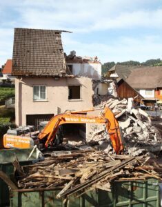 Als Heiko Lind mit seinem Longfront-Bagger nach dem Dach greift, prasseln Ziegel auf den Boden, ein mächtiges Gerippe aus mehreren Sparren und Latten zieht er herunter, Staub wirbelt auf, die Wassermassen aus dem Feuerwehrschlauch scheinen ohne große Wirkung. Die Sparren verschwinden im Sammelcontainer für Holz, fleißige Hände sortieren verbliebene Holzsplitter und Reste der Isolierung, Kunststoffteile und Leitungen und entsorgen sie getrennt in separaten Behältnissen.