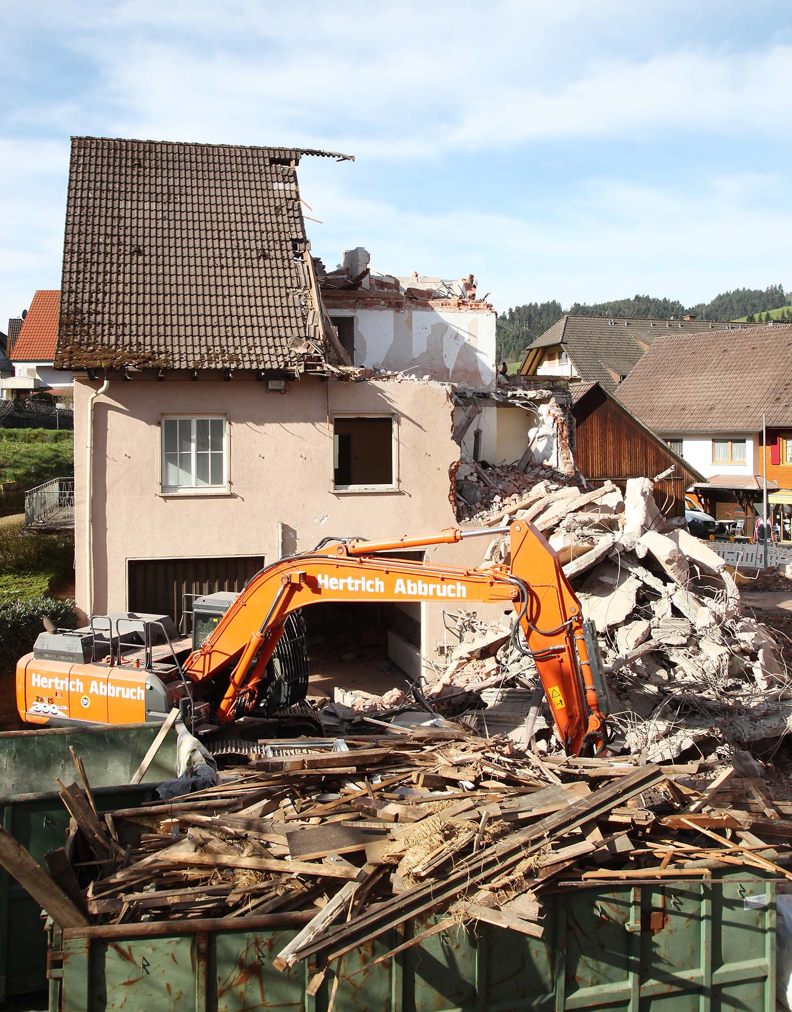 Schritt für Schritt verschwindet der gewohnte Anblick. Bevor der Bagger richtig zugreifen kann, zieht Hans Göpper mit seinem Kran den vier Tonnen schweren Abrissvorgang – vier ein Meter breite und 20 Millimeter starke Gummimatten – auf Firsthöhe, um angrenzende Gebäude zu schützen und vor allem den Verkehr auf dem Häldeleweg nicht zu gefährden.